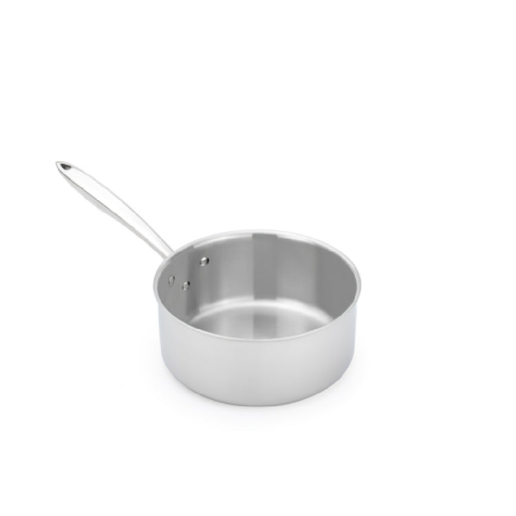 The Browne Foodservice 5724214 Thermalloy® Sauce Pan is an expertly crafted 4-quart kitchen essential, featuring a diameter of 8.7 inches and a height of 4 inches, making it a versatile tool for various culinary applications. This saucepan is meticulously designed without a cover and includes a stay-cool hollow cast riveted handle, ensuring user safety and comfort during cooking. Engineered for compatibility with multiple heat sources, it efficiently operates on gas, electric, ceramic, halogen, and induction stovetops. Constructed with tri-ply stainless steel and an aluminum core, this saucepan guarantees optimal heat distribution and retention, enhancing cooking efficiency. The satin finish interior provides a sleek look while maintaining durability, complemented by a mirror finish exterior that adds a touch of elegance to any kitchen environment. The Browne Foodservice 5724214 Thermalloy® Sauce Pan is NSF certified, assuring adherence to strict public health and safety standards, and comes in cash and carry packaging, making it an ideal choice for professional chefs, home cooks, and culinary institutions seeking high-quality cookware with reliable performance across a range of cooking methods.