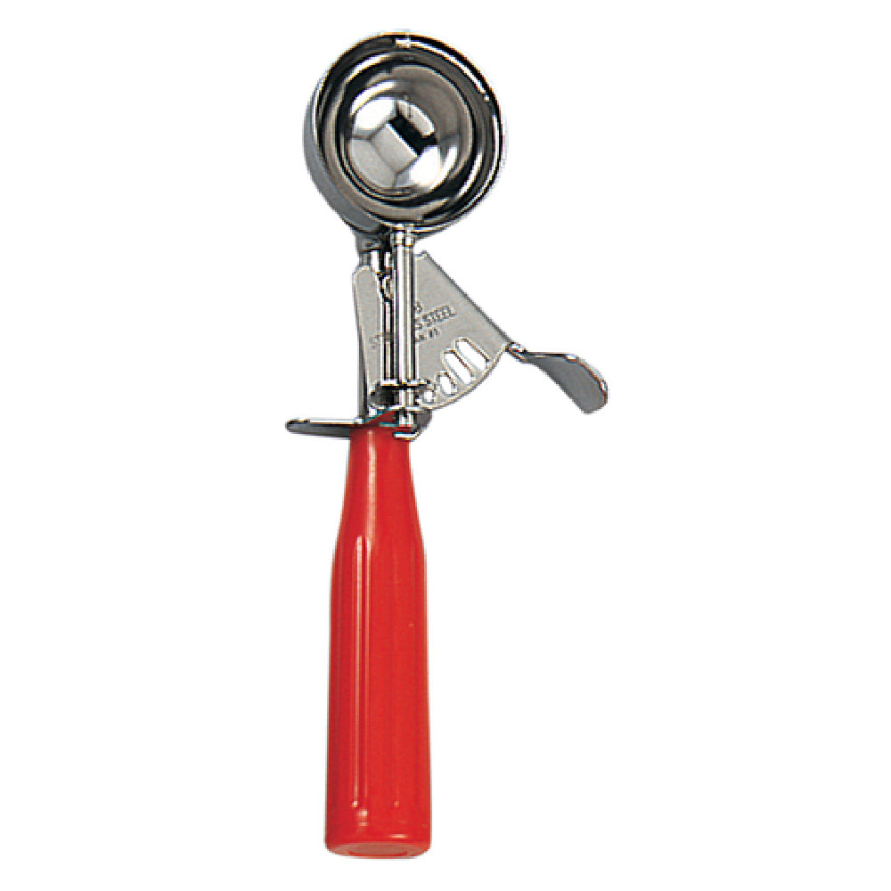 The Browne Foodservice 573324 Standard Disher Size 24-1.35 Oz. One-piece is a highly functional utensil designed for precision and durability in foodservice settings. This disher features a size 24 bowl with a capacity of 1.35 ounces, facilitating consistent portion control essential in commercial kitchens. The one-piece construction enhances its durability, reducing the risk of breakage over time. Made with an 18/8 stainless steel bowl, it ensures longevity and resistance to rust or corrosion, maintaining high hygiene standards. The ribbed polypropylene handle is ergonomically designed for a comfortable grip, even during extended use, and is color-coded red for easy identification and size differentiation in a busy kitchen environment. The size is conveniently stamped on the bowl knife blade, offering ease of identification and selection, aiding in efficiency during meal preparation. NSF certification highlights its compliance with health and safety standards, making it a reliable choice for restaurants, cafeterias, and catering services. Packaged individually, it ensures that each piece maintains its integrity until it reaches your hands. This disher is tailored to meet the needs of diverse segments within the foodservice industry, from high-volume food production facilities to small-scale eateries seeking quality and precision.