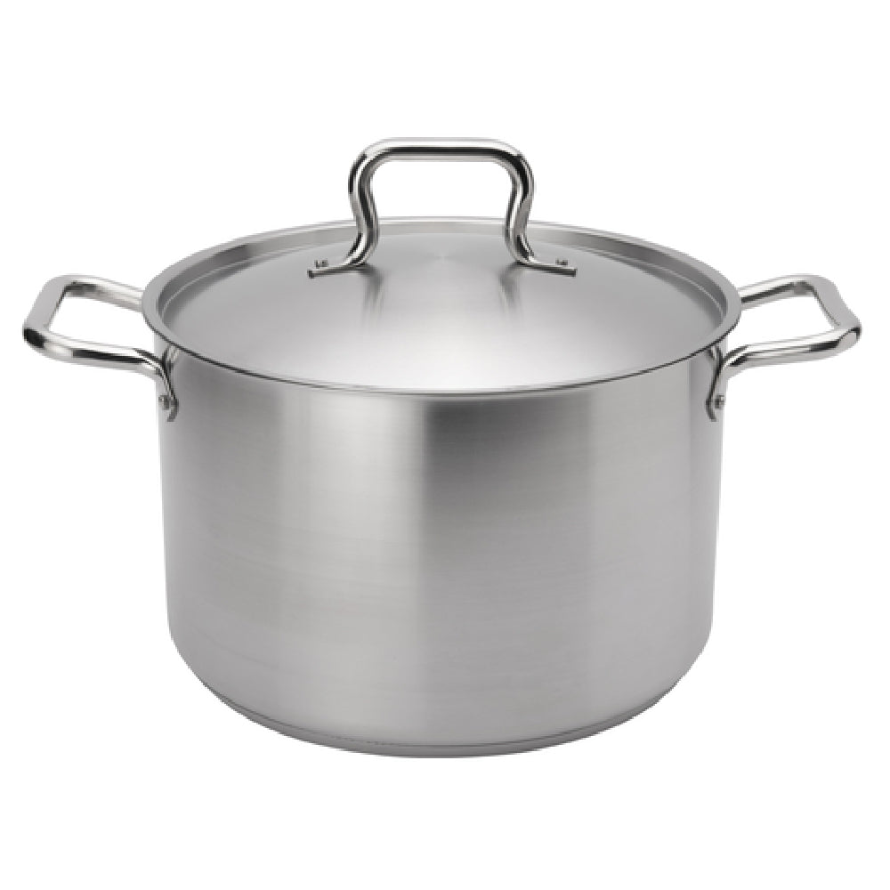 The Browne Foodservice 5733912 Elements Stock Pot - 12 Qt. 11" Dia. X 7-3/10"H is a versatile and highly functional kitchen essential, perfect for diverse culinary applications. This stock pot, constructed from durable stainless steel, is designed to withstand the rigors of a professional kitchen environment. It features a generous capacity of 12 quarts, accommodating a variety of cooking needs, from simmering stocks to boiling pasta. The pot's dimensions are 11 inches in diameter and 7-3/10 inches in height, making it a compact yet capacious cooking vessel. It is equipped with a self-basting cover, enhancing cooking efficiency by retaining moisture and flavor. The riveted loop handles ensure secure and comfortable handling, even when the pot is full. The 4mm tri-ply base facilitates excellent heat distribution and retention, compatible with multiple cooktops including gas, electric, ceramic, halogen, and induction, offering unparalleled versatility for various cooking technologies. Adhering to NSF standards, this stock pot meets strict public health and safety guidelines, making it an ideal choice for professional chefs and foodservice establishments seeking reliability and quality in their cookware. This stock pot's robust construction and thoughtful design make it an indispensable tool in any kitchen setting.