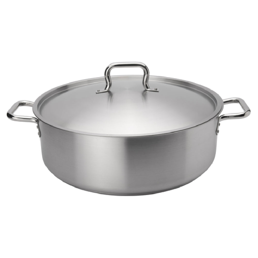 The Browne Foodservice 5734030 Elements Brazier 30 Qt. is a versatile cooking vessel designed for a variety of culinary applications in professional kitchens. With a capacity of 30 quarts, this brazier boasts a 19-7/10" diameter and a height of 6-1/10", providing ample space for large-batch cooking. The stainless steel construction ensures durability and resistance to corrosion, while the 4mm tri-ply base promotes even heat distribution, reducing the risk of hot spots. This brazier is equipped with extra wide riveted handles, enhancing safety and ease of transport, especially when dealing with heavy loads. It comes with a self-basting cover, which helps to retain moisture and flavor, making it a valuable tool for slow-cooked dishes. The versatility of the Browne Foodservice brazier is further emphasized by its compatibility with various cooktops, including gas, electric, ceramic, halogen, and induction, and it is also oven safe. Additionally, this product is NSF certified, ensuring it meets high standards for public health and safety. The Browne Foodservice 5734030 Elements Brazier is an ideal choice for restaurants, catering services, and other foodservice establishments seeking reliability and efficiency in their cooking equipment.