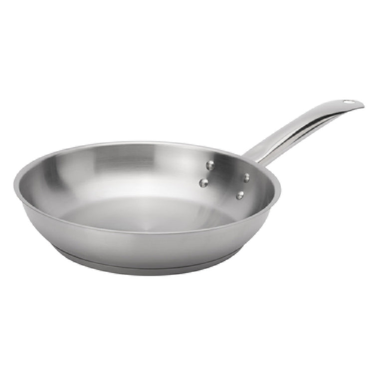 The Browne Foodservice 5734050 Elements Fry Pan is a versatile cookware choice, featuring a 9-1/2" diameter and a 2" height, making it suitable for a variety of cooking tasks. Its riveted hollow cool touch handle ensures safe and comfortable handling, even during long cooking sessions. Compatible with multiple cooktop types, including gas, electric, ceramic, halogen, and induction, this fry pan offers remarkable flexibility in the kitchen. Additionally, it is oven safe, enhancing its versatility for different cooking methods. The pan's 4mm tri-ply base provides superior heat distribution and retention, ensuring even cooking results. Constructed from durable stainless steel with a natural finish, this fry pan is built to withstand the rigors of professional kitchens or home use. It meets NSF standards, affirming its compliance with public health and safety requirements. The Browne Foodservice 5734050 Elements Fry Pan is a practical and reliable choice for culinary professionals and home cooks alike, delivering robust performance across a wide range of cooking environments.