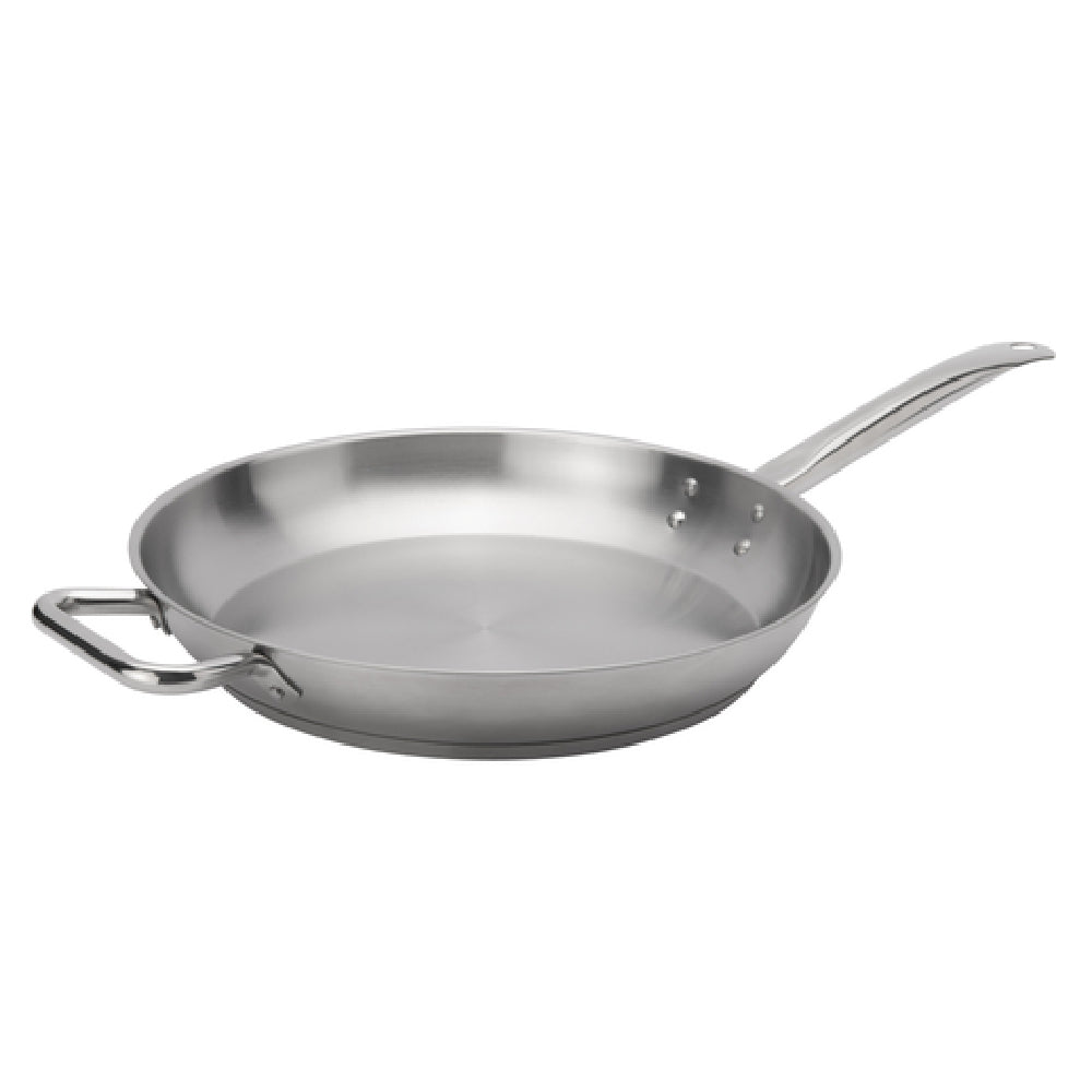 The Browne Foodservice 5734054 Elements Fry Pan is a premium culinary tool engineered to meet the demands of various cooking environments. With a diameter of 14 inches and a height of 2-2/5 inches, this fry pan is optimally sized for a range of cooking tasks. It features a riveted hollow cool touch handle, ensuring safety and comfort during use. This pan is compatible with multiple heat sources including gas, electric, ceramic, halogen, and induction cooktops, offering versatility in professional and home kitchens alike. The oven-safe design expands its utility, allowing seamless transition from stovetop to oven. The fry pan boasts a 4mm tri-ply base, which ensures even heat distribution, minimizing hotspots and enhancing cooking performance. Crafted from stainless steel with a natural finish, it combines durability with a sleek aesthetic. The Browne Foodservice 5734054 is NSF certified, reflecting its compliance with high standards of safety and sanitation, making it a reliable choice for foodservice professionals. This fry pan represents a perfect blend of functionality, durability, and versatility, catering to a wide spectrum of culinary needs across different market segments within the foodservice industry.