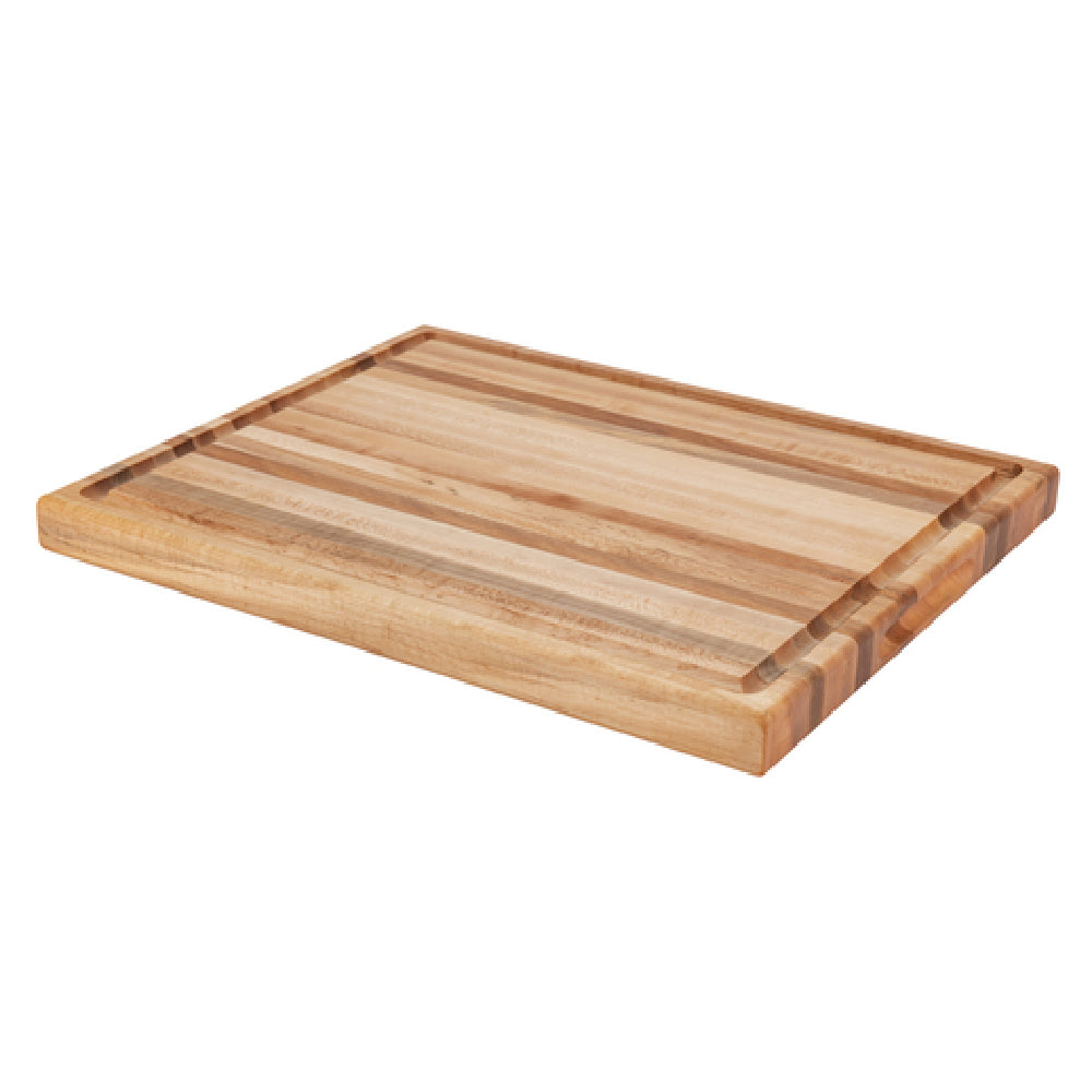 The Browne Foodservice 573616 Cutting/Carving Board 16"L x 12"W x 1-1/2"H Rectangular is a versatile kitchen essential crafted from high-quality maple wood. Designed for both cutting and carving tasks, this board features a dual-sided design that enhances its utility in food preparation environments. A distinctive no-drip juice channel is integrated into its structure, effectively capturing juices and preventing spills, making it ideal for slicing meats or juicy fruits. Indented hand grips are strategically placed for ease of handling, allowing users to transport and maneuver the board comfortably. Measuring 16 inches in length, 12 inches in width, and with a thickness of 1-1/2 inches, it provides ample space for various culinary tasks while maintaining a manageable size for storage. This product comes in cash & carry packaging, adding convenience for retail settings and storage. It serves as a reliable tool across different segments of the foodservice industry, from bustling professional kitchens to home cooking enthusiasts, delivering durability and functionality. The use of maple wood not only adds aesthetic appeal but also offers a sturdy surface that stands up to the rigors of frequent use. The Browne Foodservice 573616 board combines practicality with thoughtful design, making it a valuable addition to any kitchen.