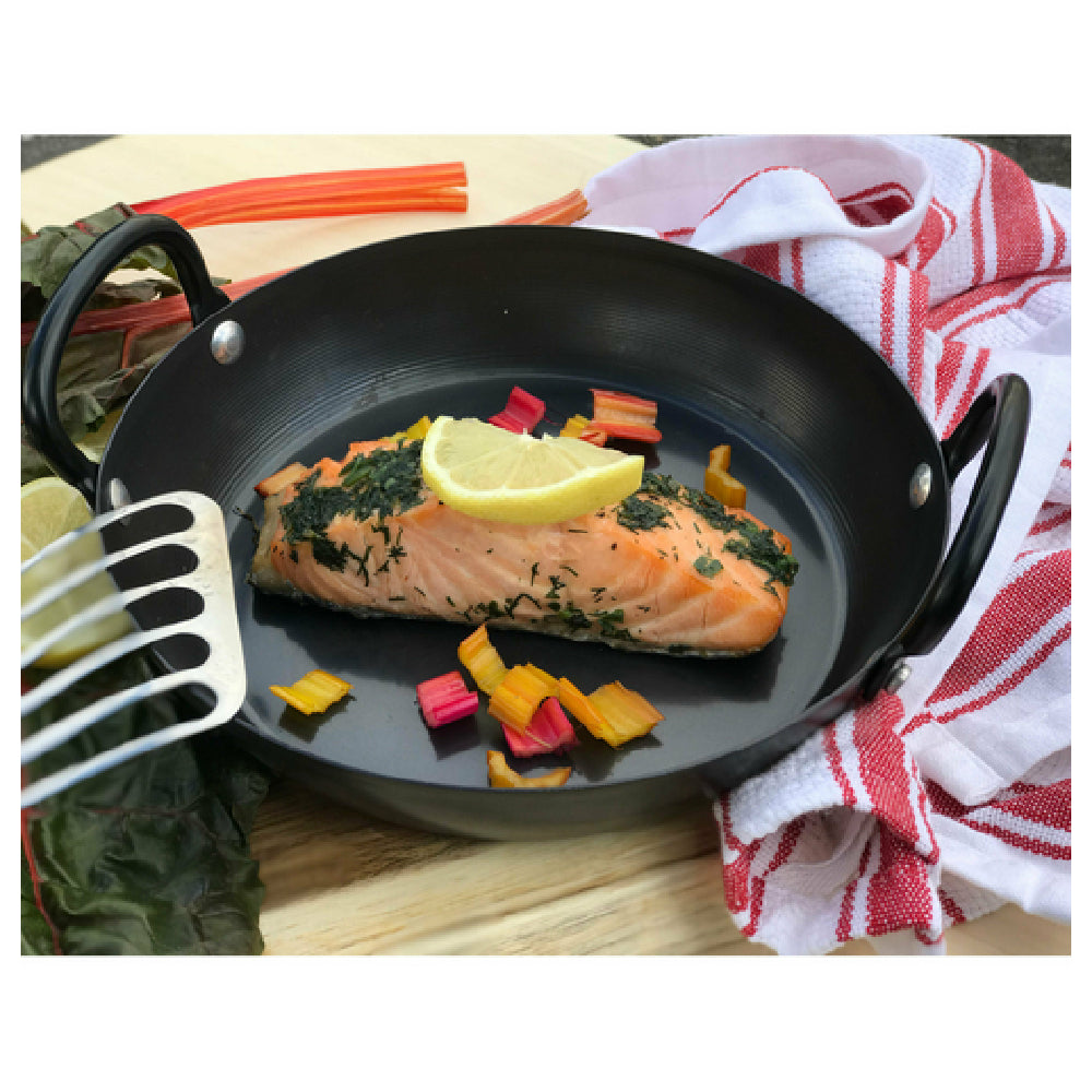The Browne Foodservice 573748 Thermalloy® Fry Pan is a versatile kitchen essential, measuring 7-4/5 inches in diameter and 1-3/4 inches in height. This fry pan is uniquely designed to operate efficiently across various cooktops, including gas, electric, ceramic, halogen, and induction, catering to diverse cooking needs. Its non-stick surface, free from PFOA and PTFE, ensures safe cooking, while the pre-seasoned carbon steel construction provides durability and improved performance over time. The pan is equipped with two riveted handles for secure handling, enhancing safety and ease of use. Additionally, this fry pan is oven safe up to 200°C (392°F), offering flexibility in cooking techniques and recipes. The sleek black finish complements its robust functionality, making it a suitable choice for professional kitchens and home cooks alike. Whether for sautéing, frying, or browning, the Browne Foodservice Thermalloy® Fry Pan combines practicality with quality, meeting the varied demands of the foodservice industry.