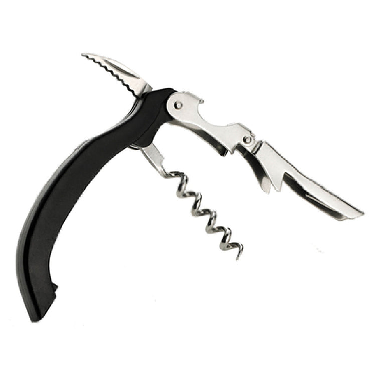 The Browne Foodservice 574075 Professional Corkscrew 4-1/2"L Double Hinged is an expertly designed tool tailored for both professional and home use in the wine and beverage industry. This corkscrew measures 4-1/2 inches in length, integrating a double-hinged fulcrum that facilitates a smooth, one-step uncorking mechanism, making it highly efficient for fast-paced environments. The inclusion of a long lever uncorking grip ensures a firm hold, reducing the effort required to open bottles with ease. Its spiral design is crafted for precision, minimizing cork breakage and ensuring a seamless extraction process. Additionally, this versatile tool features a pull-out knife for cutting foil, adding to its multifunctionality. The corkscrew is constructed with an ergonomic ABS plastic handle, providing comfort and ease of use during prolonged operations. The use of stainless steel in its build guarantees durability and resistance to wear, making it an investment for long-term use. This corkscrew serves as a valuable addition to any sommelier's toolkit, restaurant, or bar setting, where reliability and performance are paramount. Its thoughtful design meets the needs of both seasoned professionals and casual users, enhancing the overall wine service experience.