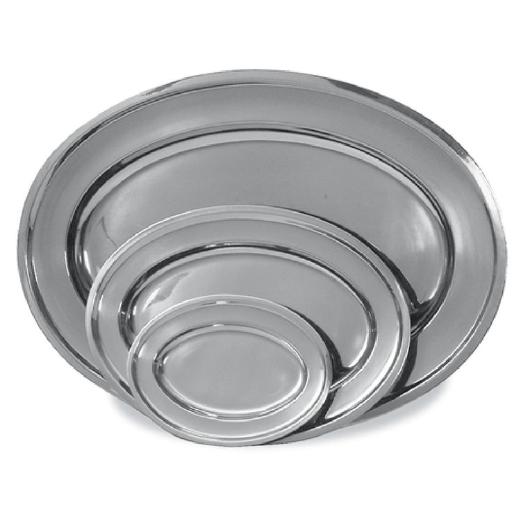 The Browne Foodservice 574183 Platter is a versatile and durable option for a wide range of foodservice environments. Measuring 16-3/10 inches by 10-7/10 inches, this oval platter provides ample space for serving a variety of dishes, making it suitable for both casual dining and upscale presentation. Crafted from stainless steel, the platter boasts a sleek and timeless appearance while ensuring long-lasting performance and resistance to corrosion. Its rolled edge design not only adds an element of sophistication but also reinforces the platter's structural integrity, providing a reliable surface for serving meals. The platter's dishwasher-safe construction facilitates easy cleaning and maintenance, an essential feature for fast-paced restaurant settings and catering services where hygiene and efficiency are paramount. This platter serves as a valuable asset for chefs and caterers aiming to present their culinary creations with both elegance and practicality. Whether it's for a bustling buffet line or a fine dining establishment, the Browne Foodservice 574183 Platter is designed to meet the diverse needs of the foodservice industry, offering a blend of style and functionality that enhances any dining experience.