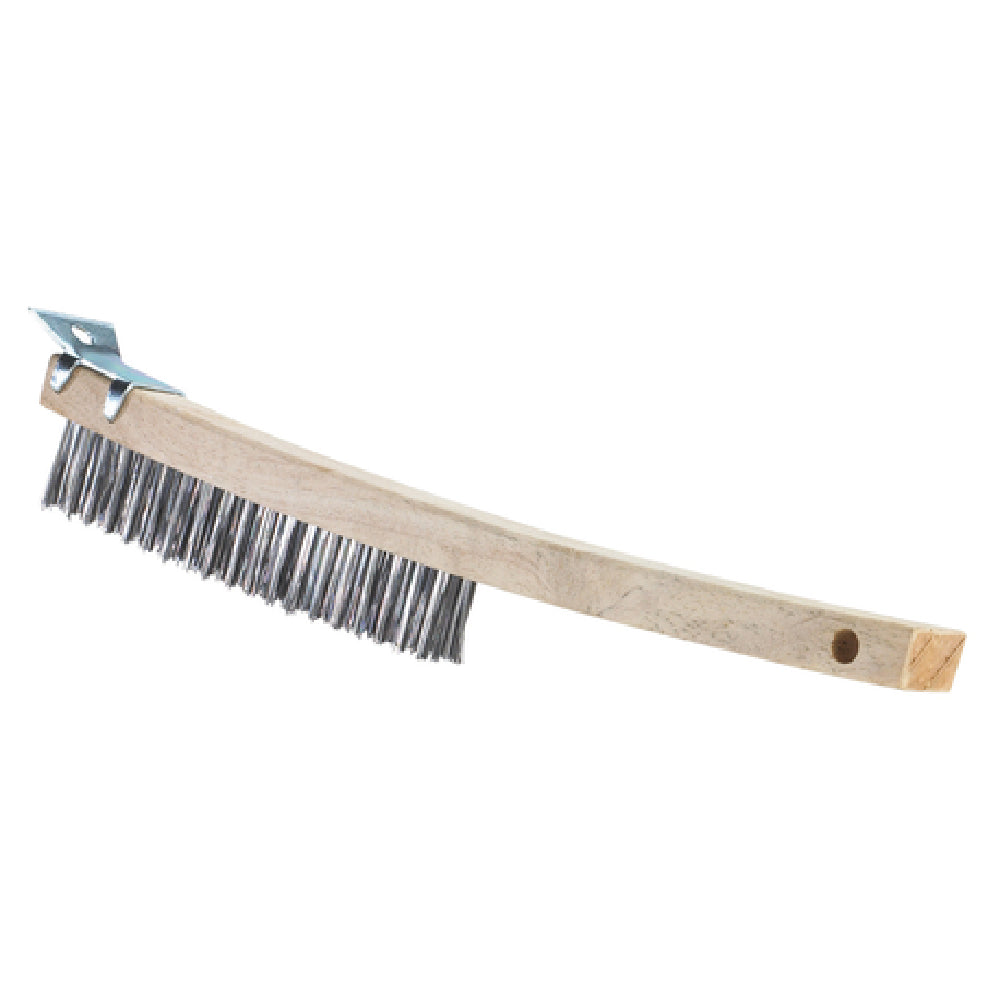 The Browne Foodservice 574260 Brush 14"L is a highly efficient tool designed for precision and durability in food service applications. With a total length of 14 inches, this brush is engineered to provide optimal reach and maneuverability for various cleaning tasks. It features a 3 x 19 configuration of wire bristles, ideal for thorough scrubbing and cleaning, ensuring effective removal of stubborn residues from grill surfaces. The inclusion of a scraper adds another layer of functionality, allowing users to tackle baked-on food with ease, enhancing its utility in both commercial kitchens and food processing environments. The brush is equipped with a wooden handle, offering a comfortable and secure grip, which reduces fatigue during prolonged use. Whether deployed in a bustling restaurant kitchen or a catering service setting, the Browne Foodservice 574260 Brush delivers reliable performance and robust construction. It is specifically tailored to meet the needs of foodservice professionals who require a dependable cleaning tool that combines efficiency with ergonomic design. This brush is a testament to practical design and quality craftsmanship, making it an essential addition to any food service operation's cleaning arsenal.