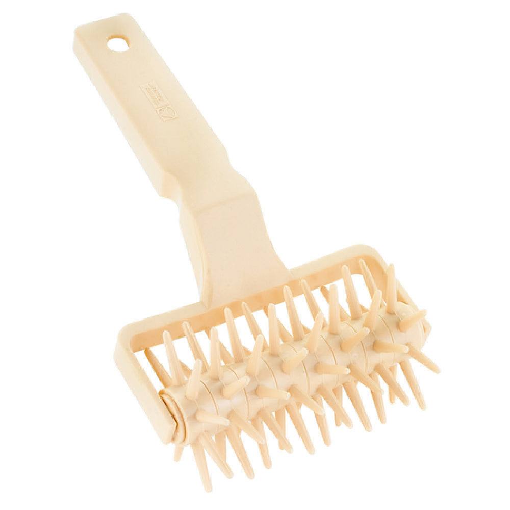 The Browne Foodservice 574265 Roller Docker measures 8-1/2 inches in width by 4-3/4 inches in length and is fitted with 64 pins, each 7/8 inch in size. Constructed from high-impact plastic, this roller docker is designed for commercial kitchens and bakeries where dough preparation is a frequent task. The robust build of the roller docker ensures durability and longevity, making it a dependable tool for bakers and chefs. The 64 pins of this roller docker are strategically positioned to deliver consistent perforation, aiding in the prevention of air bubbles in dough during the baking process. Its compact dimensions and lightweight design facilitate ease of use, while the high-impact plastic construction ensures it withstands the demands of a busy kitchen environment. Essential for pizzerias, bakeries, and foodservice operations, the Browne Foodservice 574265 Roller Docker is a practical investment for those seeking efficiency and consistency in dough preparation. This tool provides a professional standard solution for ensuring uniformity in pastry products, catering to a wide range of culinary applications across the foodservice industry.