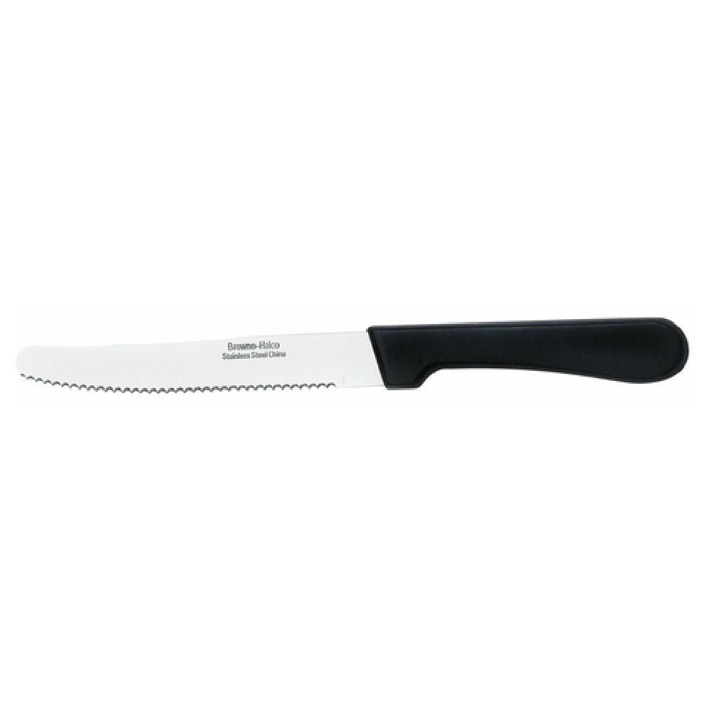 The Browne Foodservice 574329 Carnival Steak Knife is a precision-crafted utensil designed for the foodservice industry, featuring a 4-1/8-inch blade and an overall length (OAL) of 8-4/5 inches. The knife showcases a rounded blade tip, which enhances safety and control during use. Crafted from 18/0 stainless steel, this knife offers durability and corrosion resistance, making it suitable for high-volume environments. The polypropylene handle provides a comfortable and secure grip, ensuring ease of use for both professional chefs and casual diners alike. Packed by 12 per case, the Browne Foodservice 574329 caters to restaurants and catering services seeking reliable and cost-effective cutlery solutions. Its design and materials reflect a balance of practicality and performance, making it a valuable addition to any dining establishment. The composition of 18/0 stainless steel indicates its magnetic properties, potentially appealing to foodservice operations using magnetic knife storage systems. This steak knife is a testament to Browne Foodservice's commitment to quality, offering a blend of aesthetic appeal and functional integrity that meets the diverse needs of the foodservice industry.