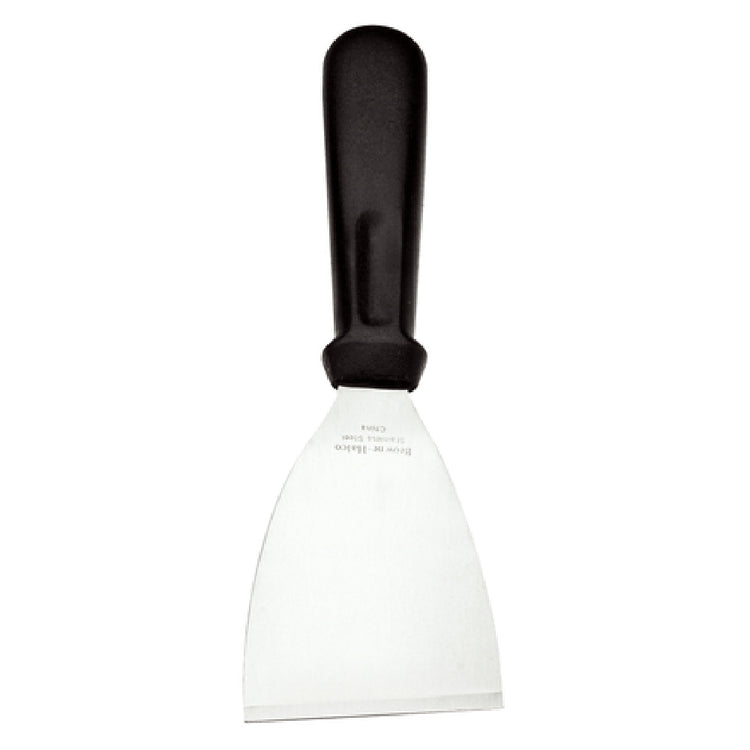 The Browne Foodservice 5744313 Pan/Griddle Scraper is an indispensable tool for professional kitchens, offering unmatched efficiency with its meticulously designed features. With a total length of 10 inches, this scraper boasts a durable 4-1/2-inch long by 3-inch wide stainless steel blade, ensuring robust performance and longevity. Its stainless steel construction makes it resistant to rust and corrosion, enhancing its durability in high-traffic foodservice environments. The scraper is equipped with a stiff blade, making it exceptionally effective for removing tough residues from pans and griddles. The black ABS handle provides a comfortable and secure grip, enabling chefs and kitchen staff to maneuver the scraper with ease and precision, even in hectic settings. This tool is ideal for various segments within the foodservice industry, including restaurants, catering businesses, and institutional kitchens, where maintaining clean cooking surfaces is paramount. Its compact and functional design makes it a practical addition to any culinary setup, underscoring its unique value proposition as a reliable, efficient, and essential implement for maintaining high standards of cleanliness and performance in professional cooking environments.