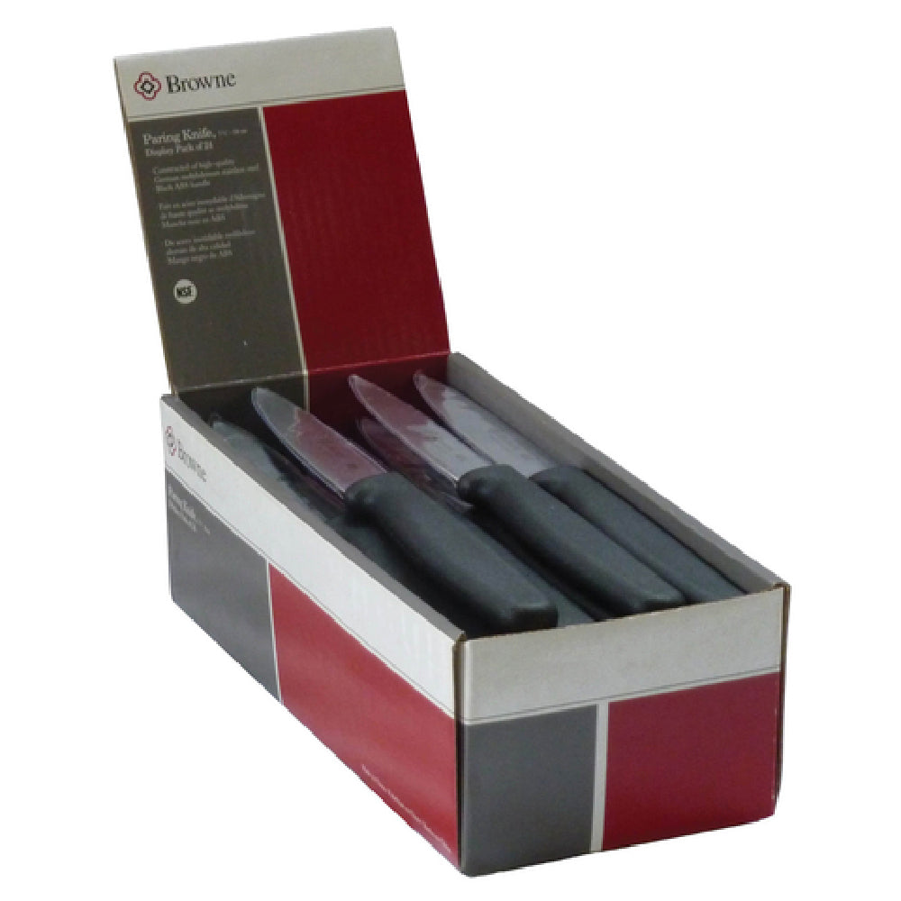 The Browne Foodservice 574460 Paring Knife 7-1/2" OAL 3" High Carbon Stain-free German Steel Blade is an exceptional tool designed for precision and durability in professional kitchens. This paring knife features an overall length (OAL) of 7-1/2 inches, making it a compact yet powerful instrument for a variety of culinary tasks. The 3-inch blade is crafted from high-carbon stain-free German steel, renowned for its ability to maintain a sharp edge while resisting stains and corrosion. This makes it an ideal choice for chefs and culinary professionals who require reliability and performance in their cutlery. The knife is equipped with a black plastic ABS handle, providing a comfortable and secure grip for enhanced control during use. Packaged in a display pack of 24, it is suitable for bulk purchase by foodservice establishments. The NSF certification reinforces its compliance with rigorous safety and quality standards, making it a trusted option for maintaining hygiene in food preparation environments. The Browne Foodservice 574460 Paring Knife combines high-grade materials with ergonomic design, tailored to meet the demands of foodservice industries, including restaurants, catering services, and culinary schools, offering a blend of precision, safety, and durability essential for professional kitchens.
