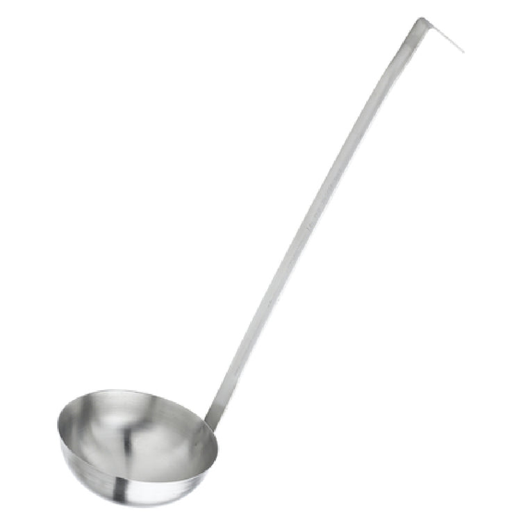 The Browne Foodservice 5747015 Conventional Ladle is a meticulously designed kitchen utensil that embodies both functionality and durability, ideal for diverse culinary environments. With a precise 1-1/2 ounce capacity, this ladle offers accurate portion control, enhancing efficiency in commercial kitchens and catering services. Measuring 9 inches in length, it provides ample reach for deep pots and containers, ensuring a clean and seamless serving experience. Constructed as a two-piece unit, this ladle features a hooked handle for convenient storage and accessibility in busy kitchen settings. The handle and bowl boast a robust thickness of 2.0 mm, crafted from heavy gauge material that ensures long-lasting use and resistance to bending or warping. The satin finish not only adds an aesthetic appeal but also aids in easy cleaning and maintenance, making it a practical choice for high-volume foodservice operations. This conventional ladle is an essential tool for chefs, banquet servers, and catering professionals who require precision and reliability. Its design and specifications make it a valuable asset for establishments ranging from fine dining restaurants to bustling cafeterias, where consistent quality and performance are paramount.