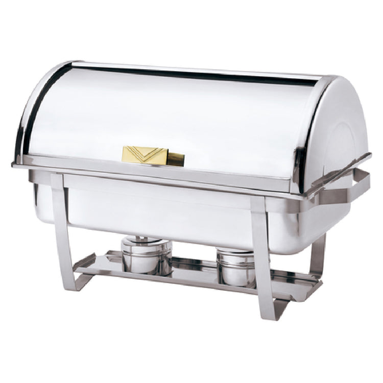 The Browne Foodservice 575135 Economy Chafer Full-size 9 Qt. is a versatile and cost-effective solution for catering events and buffet settings, providing ample space with its 9-quart capacity. This full-size chafer measures 25-1/2" x 15-1/4" x 15"H and features a rectangular design, making it ideal for accommodating a variety of dishes. The chafer includes a 90-degree roll top lid, which is equipped with a gold tone handle for easy access and a touch of elegance. Crafted from 18/8 stainless steel, the chafer boasts a mirror finish, enhancing its aesthetic appeal and durability. The unit comes complete with a 2-1/2" deep food pan and a 4" deep water pan, ensuring efficient heating and serving of food. It also includes two fuel holders, providing consistent heat to maintain optimal food temperatures. The stackable frame design facilitates easy transport and storage, making it a practical choice for foodservice establishments. With its combination of functionality and stylish design, the Browne Foodservice 575135 Economy Chafer is well-suited for different segments of the foodservice industry, from small catering businesses to large banquet operations.