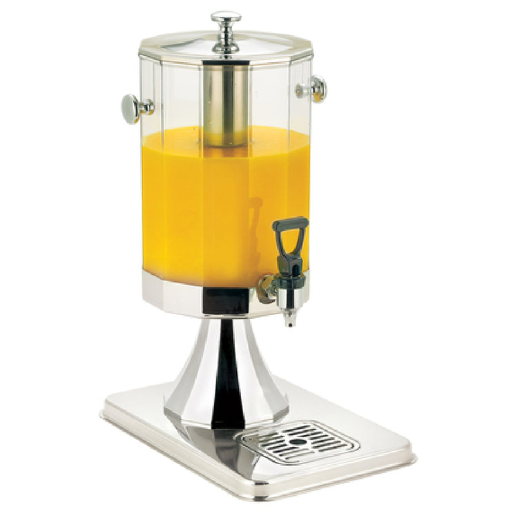 The Browne Foodservice 575160 Beverage Dispenser is a versatile and efficient unit designed for a wide range of foodservice environments. With a capacity of 7 quarts, it can provide 44 servings of 5 ounces each, making it ideal for high-volume venues. The dimensions are 14 inches in length, 9-3/5 inches in width, and 20-3/4 inches in height, offering a compact yet spacious design. Featuring a 12-sided clear polycarbonate container, this dispenser ensures durability and visibility of the contents. The removable faucet allows for a hands-free full open position, enhancing convenience and hygiene. For cooling needs, it includes a sealed-bottom stainless steel cylinder suitable for both cubed and crushed ice, ensuring beverages remain chilled. The removable drip tray simplifies maintenance and cleanliness. Its stainless steel components boast a mirror finish, providing a sleek and professional appearance. This beverage dispenser is an excellent choice for catering companies, restaurants, and hotel buffets, offering practical features and an attractive design to complement any setting. Its thoughtful construction and functionality make it a significant asset within the beverage service industry, catering to diverse market segments demanding reliability and efficiency.