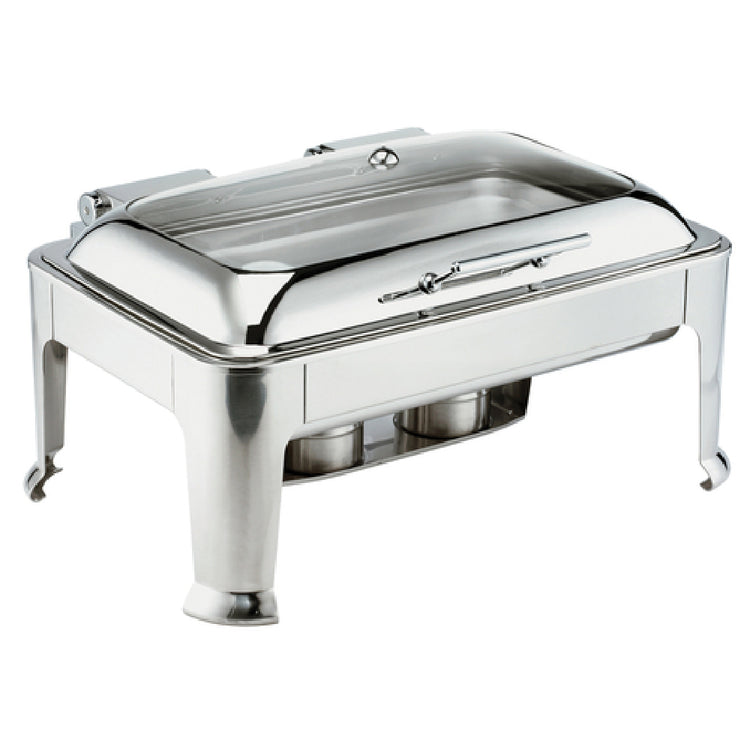 The Browne Foodservice 575162 Symphony Chafer Full-size 9 Qt. is a meticulously designed piece of equipment measuring 26-1/2 inches in length, 21-1/2 inches in width, and 17-1/2 inches in height, offering a substantial 9-quart capacity. This full-size, rectangular chafer is ideal for various food service settings, providing both functionality and elegance. It features a slow auto-close mechanism at 45 degrees, ensuring gentle closure, while the stay-open position at 60 degrees offers convenience during service. The clear glass view allows for easy visibility of the contents, enhancing presentation without compromising heat retention. Constructed from high-quality stainless steel with a mirror finish, this chafer combines durability with a sleek, polished look, making it suitable for upscale catering events and buffet settings. Its design not only facilitates efficient service but also adds an aesthetic value, making it a versatile choice for catering professionals who require equipment that is both practical and visually appealing. The Browne Foodservice 575162 Symphony Chafer is designed to meet the demands of the modern food service industry, offering a reliable solution for maintaining food temperature and presentation.