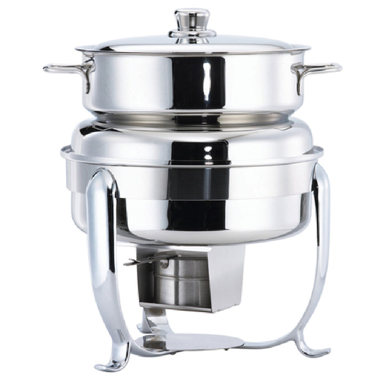 The Browne Foodservice 575172 Octave Soup Station is a meticulously designed solution for efficient soup service in various foodservice settings. With a generous capacity of 10-1/2 quarts, this station is perfect for high-volume environments, providing ample space for serving large batches of soup. The soup station measures 15 inches in diameter and stands at 17-1/2 inches high, making it a compact yet practical addition to any kitchen setup. The round soup station includes a soup tureen, water pan, and a single fuel holder, ensuring complete functionality for maintaining soup temperature. The lift-off cover allows for easy access and hassle-free refilling, while the dripless design minimizes mess, maintaining a clean service area. Crafted from durable stainless steel with a mirror finish, the soup station not only offers long-lasting performance but also adds a touch of elegance to the presentation. Ideal for catering services, buffet lines, and restaurants, this versatile product supports different segment markets within the foodservice industry by combining practicality with aesthetic appeal, enhancing both service efficiency and customer satisfaction.