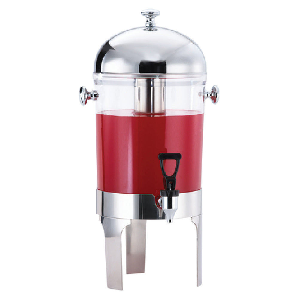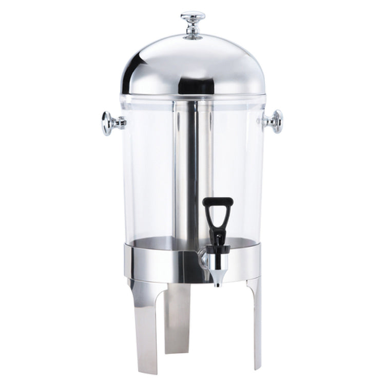 The Browne Foodservice 575179 Harmony Juice Dispenser is an innovative solution designed for efficient beverage service. With a capacity of 7 quarts, it is capable of dispensing up to 45 servings of 5 ounces each, making it ideal for high-volume environments such as hotels, event venues, or buffets. This versatile dispenser features a removable faucet, providing ease of cleaning and maintenance, while the optional hands-free operation enhances hygiene and convenience, catering to the needs of both staff and guests. The inclusion of an ice cube cylinder ensures beverages remain chilled, maintaining optimal temperature for extended periods. The dispenser's construction includes a polycarbonate container, known for its durability and resistance to impact, complemented by a stainless steel top and bottom that adds a sleek, mirror finish for a sophisticated appearance. This combination of materials not only ensures longevity but also contributes to a modern aesthetic, making the Browne Foodservice 575179 Harmony Juice Dispenser a functional and attractive addition to any foodservice operation. Its thoughtful design and robust features cater to various segments of the hospitality industry, providing reliability and efficiency where it is needed most.