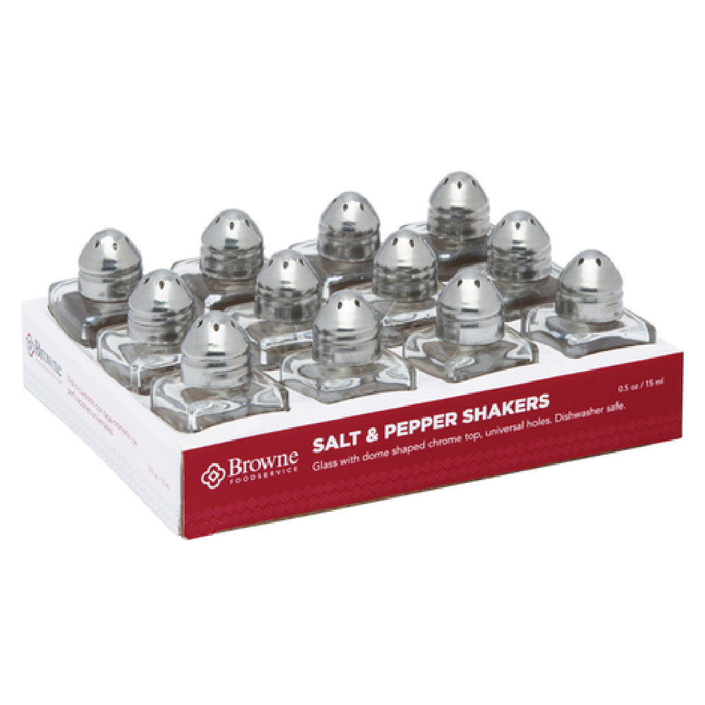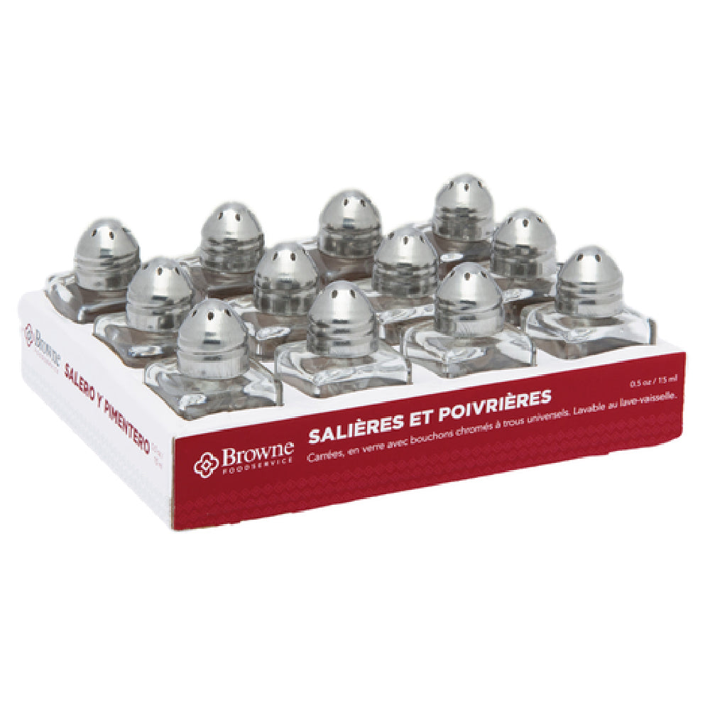 The Browne Foodservice 575225 Salt & Pepper Shaker is a compact tabletop essential, designed for versatility and functionality across various foodservice segments. With a capacity of 1/2 oz., it stands at 1-1/2 inches wide and 2 inches high, making it a mini yet practical option for any dining setup. The shaker is constructed with a clear glass jar, providing both durability and visibility of contents, while its square shape adds a touch of modernity to its design. Topped with a chrome-plated cover, it combines aesthetic appeal with corrosion resistance. The shaker's universal holes ensure optimal seasoning distribution, catering to diverse culinary needs. Sold as a set of 12, it is suitable for both small-scale establishments and large-scale operations, offering a consistent presentation across tables. Packaged in cash & carry format, it is convenient for both retail and wholesale purchase. This salt & pepper shaker set is an ideal choice for restaurants, cafes, and catering services seeking dependable, stylish, and functional seasoning solutions. Its practical size and durable construction make it an invaluable component of any dining experience, enhancing both efficiency and presentation in foodservice environments.