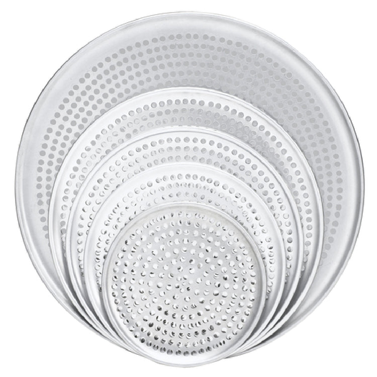 The Browne Foodservice 575353 Pizza Plate - 13" Dia. Round is meticulously designed for culinary professionals seeking precision and efficiency in pizza preparation. Measuring a compact 13 inches in diameter, this round pizza plate is crafted from high-quality aluminum, ensuring a lightweight yet robust construction. With a thickness of 1.0 mm, it promises durability and resistance to warping under high heat, making it an essential tool for both commercial and home kitchens. The 18-gauge aluminum further enhances its sturdiness, supporting heavy use in bustling food service environments. A distinctive feature of this pizza plate is its perforated design, which facilitates even heat distribution, allowing for a perfectly crisp crust by enabling moisture to escape during baking. This not only improves the texture of the pizza but also speeds up cooking time, increasing efficiency. The Browne Foodservice 575353 Pizza Plate is an invaluable asset for pizzerias, restaurants, and catering services, providing consistent results and elevating the quality of pizza offerings. Its thoughtful construction and practical design underscore its role as a reliable and high-performing tool in professional food service settings.