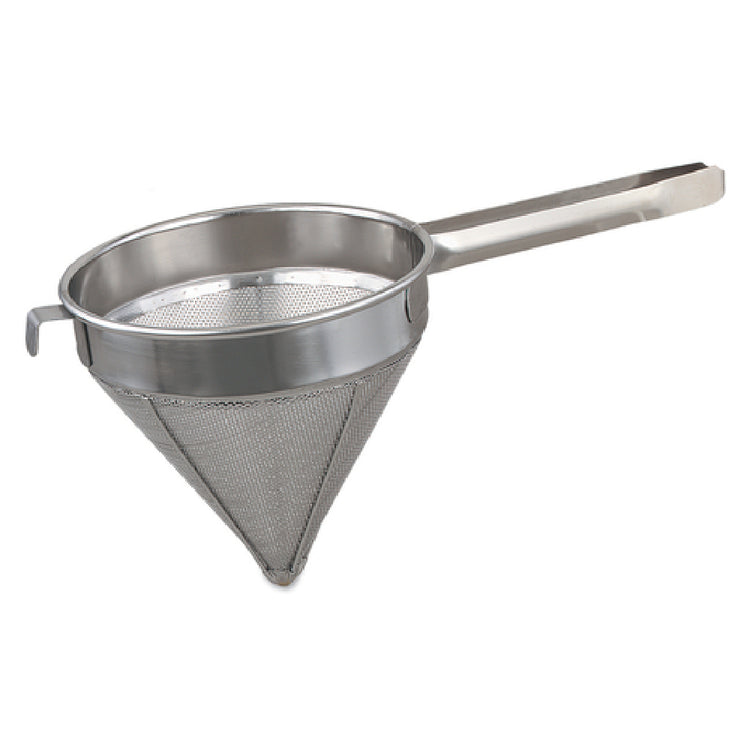 The Browne Foodservice 575409 China Cap 2-4/5 Qt. 9" Dia. Bowl is a meticulously crafted kitchen tool designed for professionals requiring precision in their culinary endeavors. This china cap features a fine mesh design, allowing for the efficient straining of sauces, soups, and stocks, ensuring a smooth and refined texture. Its 2-4/5 quart capacity makes it suitable for both small and large volume operations, accommodating various kitchen needs. The 9-inch diameter bowl provides a generous surface area for effective straining and sifting. Constructed from high-quality 18/8 stainless steel, this china cap promises durability and resistance to rust and corrosion, ensuring longevity in demanding foodservice environments. A unique one-piece grooved handle offers a comfortable and secure grip, enhancing the user's control and safety during use. The perforated metal body of this tool further aids in efficient liquid drainage, making it an indispensable asset for chefs and culinary professionals. Whether in a bustling restaurant, a catering service, or a gourmet home kitchen, the Browne Foodservice 575409 China Cap stands out for its blend of functionality, durability, and superior construction, tailored to meet the diverse needs of foodservice industry professionals.