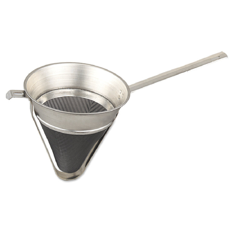 The Browne Foodservice 575514 Bouillon Strainer 2-1/4 Qt. 8" Dia. Bowl is a meticulously crafted kitchen tool, designed to meet the demands of professional chefs and foodservice operations. This strainer features a substantial capacity of 2-1/4 quarts and an 8-inch diameter bowl, making it ideal for straining large quantities of liquids and ensuring efficient workflow in busy kitchens. The inclusion of a reinforcement bar enhances its structural integrity, providing durability and stability during use. This product is equipped with a pan hook, offering convenient hands-free operation and allowing it to rest securely on pots or bowls during straining. The extra-fine mesh is a standout feature, ensuring that even the smallest particles are filtered out, resulting in silky smooth sauces and soups. Constructed from high-quality stainless steel, the strainer promises longevity and resistance to rust and corrosion, making it a reliable choice for both commercial kitchens and catering businesses. Whether used in a bustling restaurant kitchen or a high-volume catering setup, the Browne Foodservice 575514 Bouillon Strainer delivers exceptional performance with its blend of practicality and precision, catering to diverse culinary needs with unrivaled efficiency and quality.