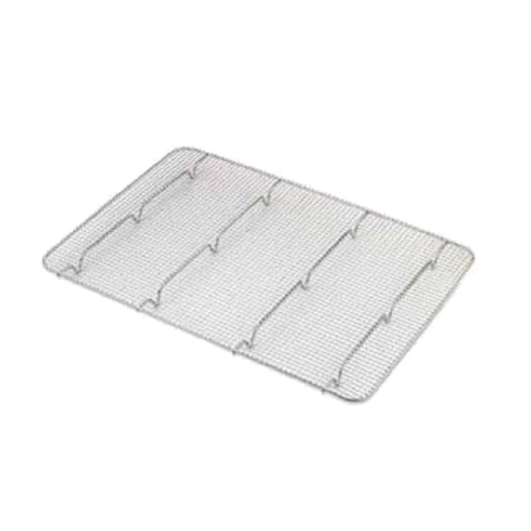 The Browne Foodservice 575519 Pan Grate For Full Size Pan 24" X 16" X 1-3/10" is a robust and versatile tool crafted for professional kitchens and foodservice establishments. Engineered with a practical footed design, this pan grate provides an elevated platform that enhances airflow around your baked or roasted items, promoting even cooking and cooling. Its dimensions - 24 inches by 16 inches with a height of 1-3/10 inches - make it compatible with full-size pans, ensuring seamless integration into existing kitchen setups. Constructed from nickel-plated wire mesh, it offers superior durability and resistance to corrosion, contributing to a long-lasting performance even in the most demanding environments. The nickel-plating not only adds a layer of protection but also facilitates easy cleaning, maintaining hygiene standards crucial in food preparation areas. This pan grate is particularly beneficial for bakers and chefs looking to optimize their cooking processes, as well as catering businesses that require reliable and efficient tools for large-scale food production. Its precise construction supports an array of culinary tasks, from baking to roasting, making it an indispensable asset in any professional kitchen setting where consistency and quality are paramount.