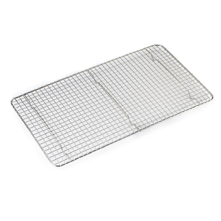 The Browne Foodservice 575527 Pan Grate is a precisely engineered kitchen accessory, designed to optimize the functionality of full-size pans. Measuring 18 inches in length, 10 inches in width, and 9/10 inches in depth, this pan grate is tailored to fit seamlessly into a standard full-size pan. The footed design elevates food items, enhancing air circulation and promoting even cooking or cooling, which is vital for culinary professionals seeking consistent results. Crafted from durable steel wire and finished with a nickel plating, it offers both strength and resistance to wear, making it a reliable choice for busy foodservice environments. Its robust construction ensures longevity, while the nickel plating adds an extra layer of protection against rust and corrosion, maintaining its pristine appearance over time. This pan grate is an essential tool for commercial kitchens, catering businesses, and bakeries, where efficiency and quality are paramount. By integrating this pan grate into their operations, culinary professionals across various segments can achieve improved food safety and presentation, ensuring that dishes are both visually appealing and served at optimal temperatures. This product's thoughtful design and high-quality materials underscore its role as an indispensable component in any professional kitchen setting.