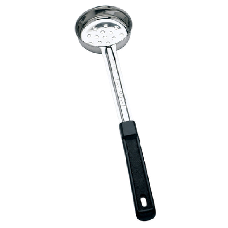 The Browne Foodservice 5757231 Food Portioner 3 Oz. - 10-4/5"L is a versatile tool designed to meet the needs of professional kitchens and foodservice operations. With a capacity of 3 ounces, it is perfect for precise portion control, ensuring consistency across servings. The portioner measures 10-4/5 inches in length, providing an ideal balance between reach and control. Its perforated design allows for efficient draining of excess liquid, which is particularly useful in preparing salads or other dishes requiring liquid separation. Constructed as a one-piece unit, this portioner offers enhanced durability and ease of cleaning. The handle is made from polypropylene, offering heat resistance up to 392°F (200°C), which ensures safe usage in high-temperature environments. Additionally, the portioner features a 1.0 mm thickness stainless steel construction, providing strength and resistance to corrosion. The black polypropylene handle not only contributes to the heat resistance but also offers a comfortable grip for extended use. This food portioner is ideal for a variety of settings, including restaurants, catering operations, and institutional kitchens, where precision, durability, and temperature resistance are critical. Its thoughtful design and robust construction make it a reliable choice for professionals seeking quality and efficiency in food service tools.