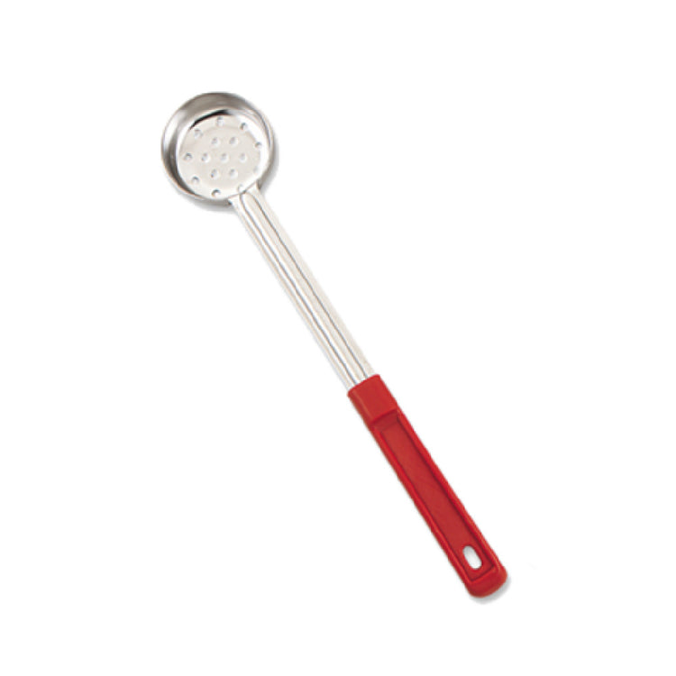 The Browne Foodservice 5757421 Food Portioner 2 Oz. 10-4/5"L is an expertly designed kitchen tool, constructed to meet the demands of various segments within the foodservice industry. This portioner is engineered with a perforated, one-piece design, making it an ideal choice for precise serving needs, particularly when straining is required. With a 2 oz. capacity, it ensures consistent and accurate portion control, essential for maintaining cost efficiency in commercial kitchens. The polypropylene handle is heat resistant up to 392°F (200°C), providing safe usage in high-temperature environments. Measuring 10-4/5 inches in length, the portioner offers a comfortable reach, enhancing user efficiency and reducing fatigue during prolonged use. Crafted with a 1.0 mm thickness of stainless steel, the Browne Foodservice portioner guarantees durability and long-lasting performance. The red color of the handle aids in quick identification and prevents cross-contamination in busy kitchen settings. This food portioner is not only a practical asset for restaurants and catering services but also serves as a reliable tool for institutional kitchens and culinary schools, where precision and safety are paramount.