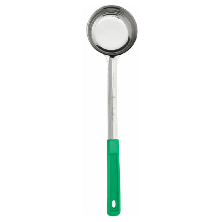 The Browne Foodservice 5757440 Food Portioner 4 Oz. 10-4/5"L is a highly functional tool designed for precise portion control, essential for various foodservice environments. This food portioner features a solid, one-piece construction, enhancing its durability and reliability. Its handle is crafted from polypropylene, a material known for its high heat resistance, withstanding temperatures up to 392°F (200°C), ensuring safety and longevity even in demanding kitchen settings. The portioner's overall length is 10-4/5 inches, providing an ergonomic grip that facilitates effortless serving. The stainless steel construction, with a thickness of 1.0 mm, contributes to its robust build, ensuring it withstands the rigors of frequent use. Additionally, the portioner is designed with a green handle, offering a color-coded solution for easy identification and organization in busy kitchens. This product is ideal for use in restaurants, catering services, and institutional dining, where accurate portion sizes are crucial for cost control and consistency in food preparation. Its sturdy build and thoughtful design make it a valuable asset for professionals seeking efficiency and precision in their foodservice operations.
