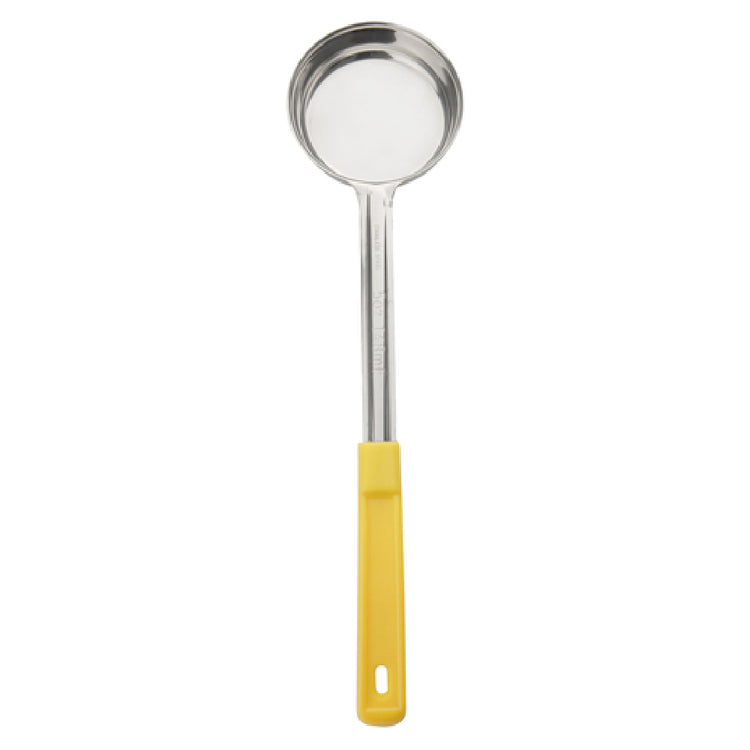 The Browne Foodservice 5757450 Food Portioner 5 Oz. 10-4/5"L is a precision-engineered tool designed for consistent portion control in professional kitchens. This food portioner, measuring 10-4/5 inches in length, is crafted with a solid, one-piece construction, ensuring durability and reliability in demanding food service environments. It features a polypropylene handle, which is heat resistant up to 392°F (200°C), providing a safe and comfortable grip even in high-temperature settings. The stainless steel head, with a thickness of 1.0 mm, offers robust performance and long-lasting use, making it ideal for repetitive tasks in high-volume establishments. The bright yellow handle not only adds a splash of color but also aids in easy identification and organization within a busy kitchen. The Browne Foodservice Food Portioner is particularly beneficial for restaurants, cafeterias, and catering services seeking to maintain precise and uniform serving sizes, thereby enhancing customer satisfaction and reducing food waste. Its sturdy design and functional features make it a valuable tool for chefs and foodservice professionals who prioritize efficiency and consistency in their operations.
