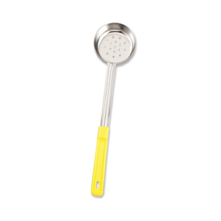 The Browne Foodservice 5757451 Food Portioner 5 Oz. 10-4/5"L is a meticulously designed tool ideal for precise food portioning across diverse market segments in the foodservice industry. This portioner features a 5-ounce capacity, making it suitable for consistent serving sizes, essential for maintaining portion control in professional kitchens. Its length of 10-4/5 inches provides an extended reach, allowing for ease of use when serving from deep containers. The portioner is crafted from durable stainless steel, with a thickness of 1.0 mm, ensuring longevity and resistance to corrosion. Its perforated design allows for efficient drainage of excess liquids, making it particularly useful in scenarios involving sauces or broths. The one-piece construction enhances its structural integrity, reducing wear over time. Furthermore, the polypropylene handle is not only ergonomic but also heat resistant up to 392°F (200°C), offering safety and comfort during use. The handle's yellow color aids in quick identification and differentiation within a busy kitchen environment. This combination of features makes the Browne Foodservice 5757451 Food Portioner a versatile and reliable tool for culinary professionals seeking precision and efficiency in food service operations.
