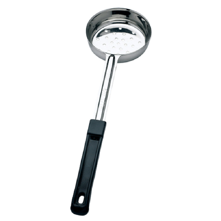 The Browne Foodservice 5757461 Food Portioner 6 Oz. 10-4/5"L is a precisely engineered tool designed to meet the rigorous demands of the foodservice industry. This portioner features a perforated design, allowing for efficient draining of liquids, which is particularly beneficial in commercial kitchens. Crafted from high-quality stainless steel with a thickness of 1.0 mm, it ensures durability and resistance to corrosion, making it a long-lasting addition to any kitchen environment. The ergonomic polypropylene handle enhances user comfort and is heat resistant to temperatures up to 392°F (200°C), ensuring safety during handling of hot foods. Measuring 10-4/5 inches in length, this portioner provides an optimal balance between control and reach, which is ideal for precise serving tasks. The black handle not only provides a sleek aesthetic but also helps in identifying the utensil among other kitchen tools. This one-piece construction eliminates seams that can harbor bacteria, promoting hygiene standards critical in foodservice operations. Whether used in restaurants, catering businesses, or institutional dining facilities, the Browne Foodservice 5757461 Food Portioner combines practical functionality with robust construction, making it an indispensable tool for professionals seeking reliable and efficient portion control.