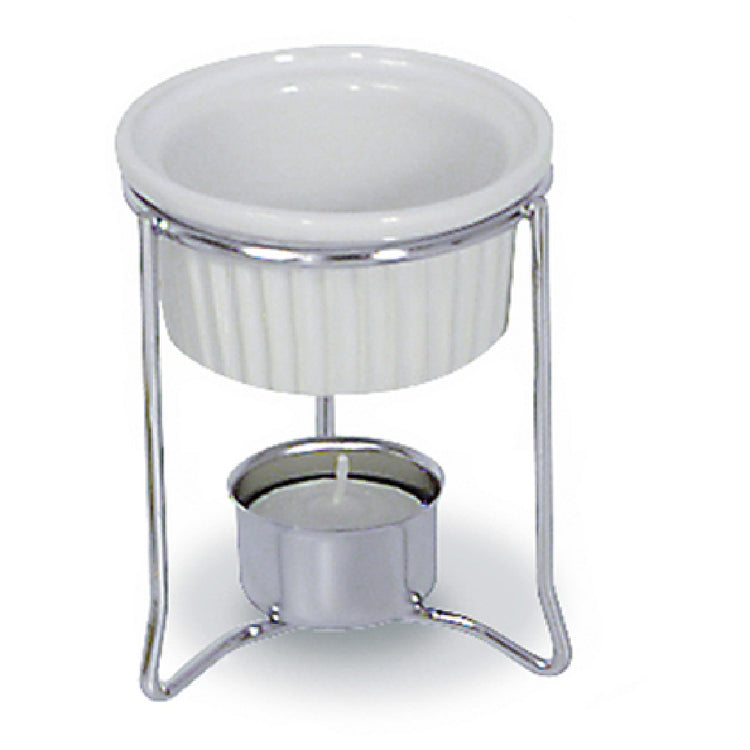 The Browne Foodservice 575767 Butter Warmer is a compact and efficient tool designed for professional kitchens and culinary establishments that require precise butter melting. This butter warmer features a 4 oz. capacity, ideal for small to medium culinary tasks, and measures 3-1/2" x 4-3/10", making it a space-saving addition to any kitchen setup. The inclusion of a stoneware pot ensures even heat distribution, maintaining the perfect temperature for melted butter without burning. Its chrome-plated frame not only provides a sleek, polished appearance but also adds durability to withstand frequent use in busy environments. This product appeals to different segments of the foodservice industry, from small cafes to large-scale restaurants, by offering a reliable solution for maintaining butter at optimal consistency for service. The Browne Foodservice 575767 Butter Warmer is an essential piece for chefs and kitchen staff who prioritize quality and efficiency in their food preparation processes.