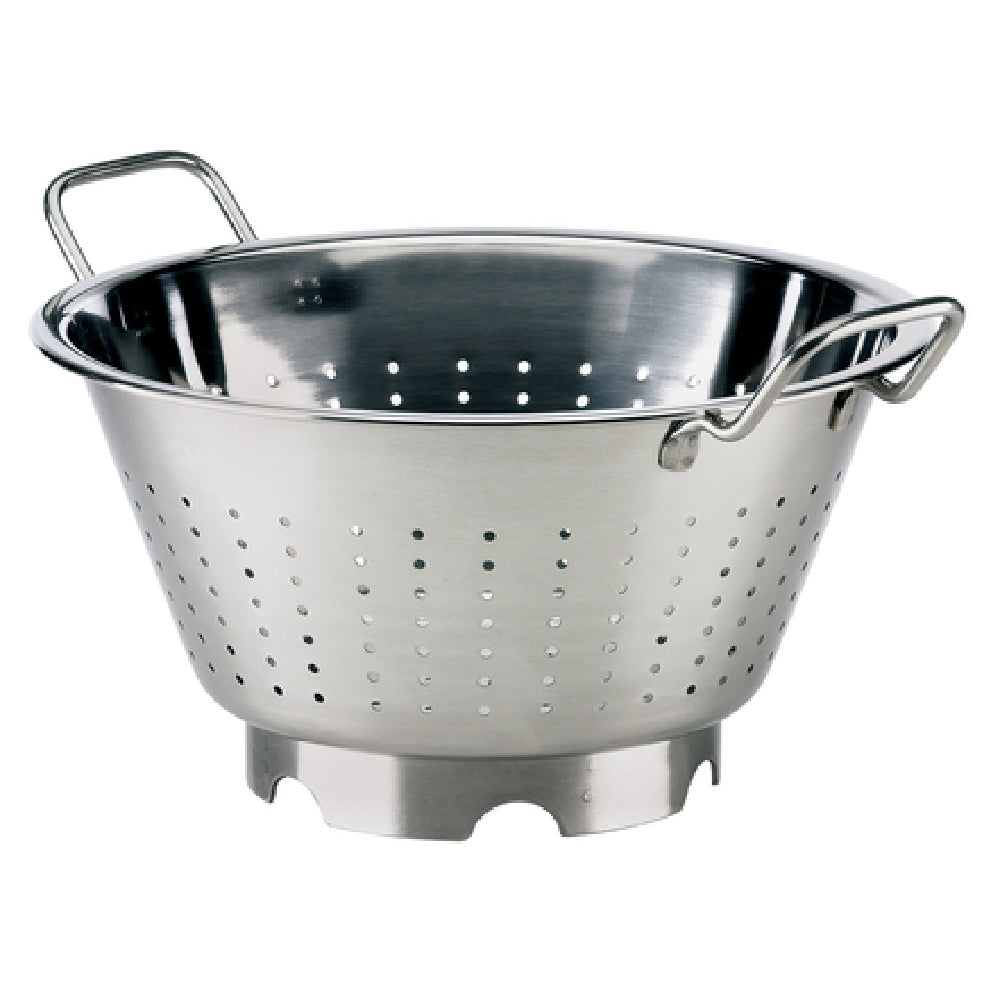 The Browne Foodservice 575950 European Colander is a meticulously designed kitchen essential with a substantial capacity of 7-1/4 quarts, making it suitable for a variety of culinary uses from professional kitchens to home cooking. Its generous 12-3/4" diameter allows for efficient rinsing and draining of larger quantities of food, while its wide, deep bottom and tall sides ensure thorough and even draining. The colander is equipped with looped handles, offering a secure and comfortable grip for easy handling. Additionally, its wide footed base provides stability and prevents tipping during use, which is crucial in busy kitchen environments. Crafted from high-quality stainless steel, this colander boasts a mirror finish that not only enhances its aesthetic appeal but also ensures durability and resistance to corrosion, making it a long-lasting tool in any foodservice operation. The Browne Foodservice 575950 is an ideal choice for those seeking a reliable and efficient colander, whether in a bustling restaurant setting or a home kitchen, offering practicality without compromising on style and performance.