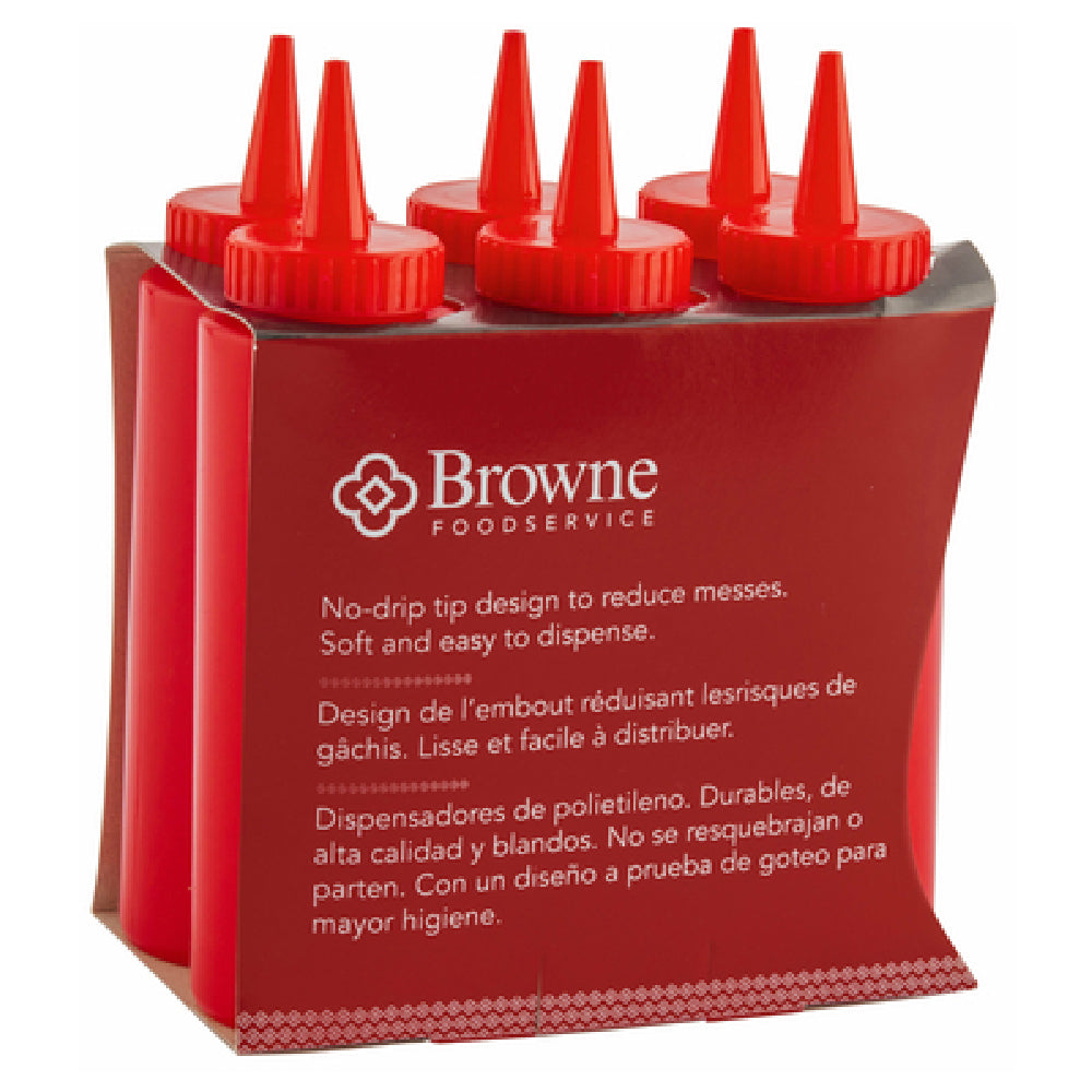 The Browne Foodservice 57800805 Squeeze Bottle 8 Oz. Ketchup is a practical solution for efficient condiment dispensing in various foodservice environments. This set of six squeeze bottles is engineered for durability and ease of use, featuring a no-drip tip that minimizes mess and waste. Each bottle has a capacity of 8 ounces, making them ideal for individual table use or back-of-house operations where precise portion control is essential. Constructed from high-quality polyethylene, these bottles are both lightweight and robust, with a vibrant red color that makes them easily identifiable in fast-paced settings. The inclusion of cash & carry packaging adds convenience for distributors and end-users alike, ensuring these bottles are ready for immediate use upon purchase. These features collectively highlight the unique value proposition of the Browne Foodservice 57800805, making it a versatile choice for restaurants, catering services, and other food service sectors that require reliable and efficient condiment dispensers. Whether in a bustling diner or a high-volume cafeteria, these squeeze bottles provide a straightforward solution for maintaining cleanliness and enhancing operational efficiency.