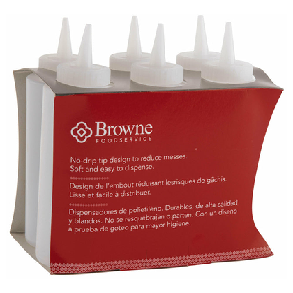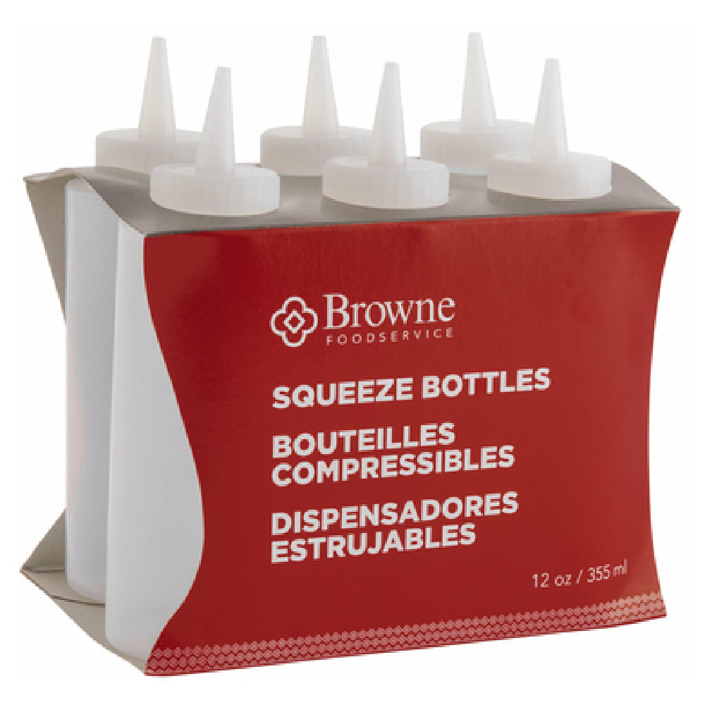 The Browne Foodservice 57801200 Squeeze Bottle 12 Oz. Dressing is a versatile and practical solution for various foodservice needs, offering precise control and convenience. Each set contains six 12 oz. squeeze bottles, crafted from durable polyethylene, ensuring reliability and longevity in busy kitchen environments. These clear bottles are designed with a no-drip tip, which minimizes waste and maintains cleanliness, making them ideal for dispensing dressings, sauces, and condiments efficiently. The squeeze bottle's transparent material allows for easy identification of contents and monitoring of quantity, enhancing operational efficiency. Its compact size makes it suitable for both front-of-house and back-of-house applications, catering to different segment markets such as restaurants, cafes, and catering services. The cash & carry packaging adds an extra layer of convenience, allowing for immediate stocking and usage. The Browne Foodservice Squeeze Bottle combines practicality with functionality, ensuring that it meets the demands of professional kitchens while enhancing the food preparation and service experience. Its user-friendly design and high-quality construction make it an essential tool for any foodservice establishment looking to optimize their condiment and dressing dispensing processes.