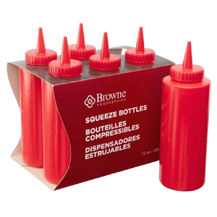 The Browne Foodservice 57801205 Squeeze Bottle 12 Oz. Ketchup is an exceptional tool designed for diverse foodservice environments, delivering both practicality and efficiency. Featuring a 12 oz. capacity, this squeeze bottle is crafted from durable polyethylene, ensuring long-lasting use and resilience in high-volume settings. Its vibrant red color not only distinguishes it as a ketchup container but also adds a touch of vibrancy to any kitchen setup. A standout feature is its no-drip tip, which expertly minimizes mess and waste, providing a cleaner and more efficient dispensing experience. This bottle comes in a set of six, making it an ideal choice for establishments requiring multiple dispensers for various kitchen stations or tables. The Browne Foodservice 57801205 Squeeze Bottle is packaged in cash & carry packaging, promoting ease of transport and convenience for bulk purchases. Its design caters to a range of markets within the foodservice industry, including restaurants, cafeterias, and catering services, where maintaining cleanliness and portion control are paramount. This thoughtfully engineered squeeze bottle combines functionality with simplicity, making it a valuable asset for any professional kitchen seeking to enhance its condiment dispensing efficiency.