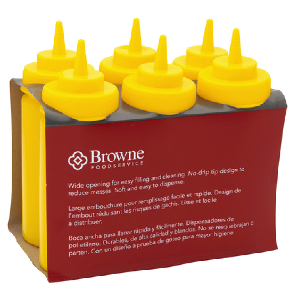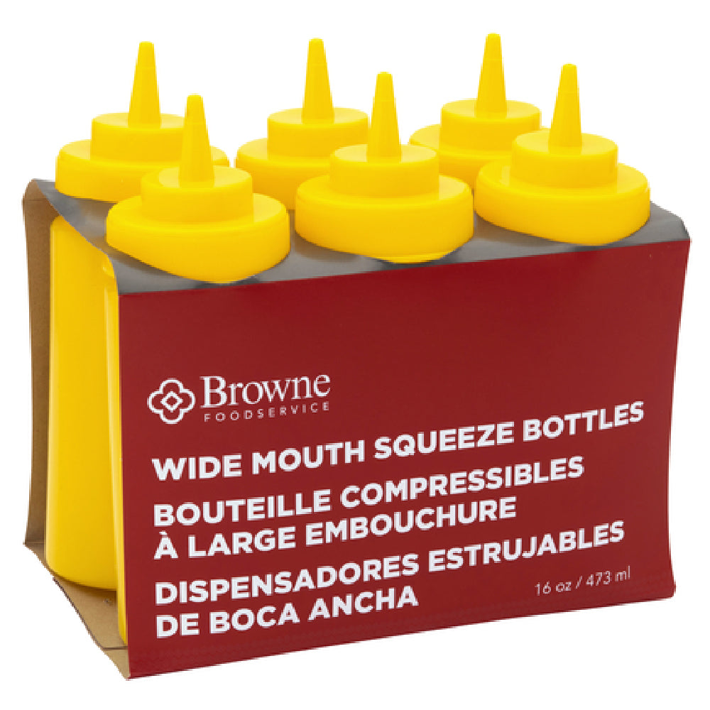 Browne Foodservice 57801717 Squeeze Bottle 16 Oz. Wide Mouth is a high-quality polyethylene squeeze bottle designed for diverse foodservice environments. With a 16 oz. capacity, it provides ample space for a variety of condiments, sauces, or dressings, making it a versatile tool for kitchens, cafeterias, and catering events. This product comes in a set of six, allowing for multiple uses or the opportunity to manage different condiments efficiently. The wide mouth design facilitates easy filling and cleaning, ensuring a seamless user experience and maintaining hygiene standards. Additionally, the no-drip tip feature minimizes mess and waste, promoting a clean and efficient service. The bottle is colored yellow, which can help with product differentiation and organization in busy kitchen environments. This squeeze bottle is packaged for cash and carry, emphasizing convenience and immediate usability. The Browne Foodservice 57801717 Squeeze Bottle is an essential tool for foodservice professionals seeking reliability and functionality in their condiment dispensing solutions.