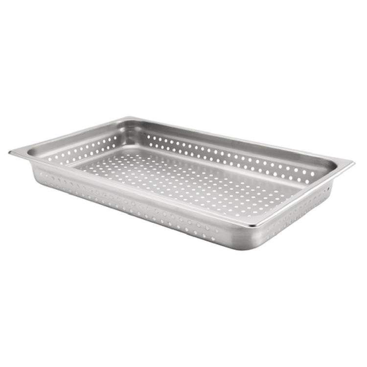 The Browne Foodservice 5781112 Steam Table Pan 1/1 Full Size 8.2 Qt. is a versatile kitchen essential crafted for professional foodservice environments. This full-size steam table pan measures 20-3/4"L x 12-3/4"W x 2-1/2" deep, providing ample space with a capacity of 8.2 quarts. Constructed from durable 18/8 stainless steel, the pan ensures longevity and resistance to corrosion, making it ideal for high-volume kitchens. The perforated design enhances steam circulation, promoting even cooking and efficient drainage of excess liquids. The anti-jam feature prevents pans from sticking together during stacking, enabling seamless kitchen operations. With a sturdy 24-gauge thickness, this pan is engineered to withstand rigorous use in various culinary settings. Its compatibility with standard steam tables makes it a practical choice for catering, buffets, and cafeteria services. Whether it’s for keeping food warm or steaming vegetables, the Browne Foodservice 5781112 offers a reliable solution for maintaining food quality. This steam table pan stands out due to its robust construction and functional design, making it a vital component for chefs and foodservice professionals seeking efficiency and durability in their operations.
