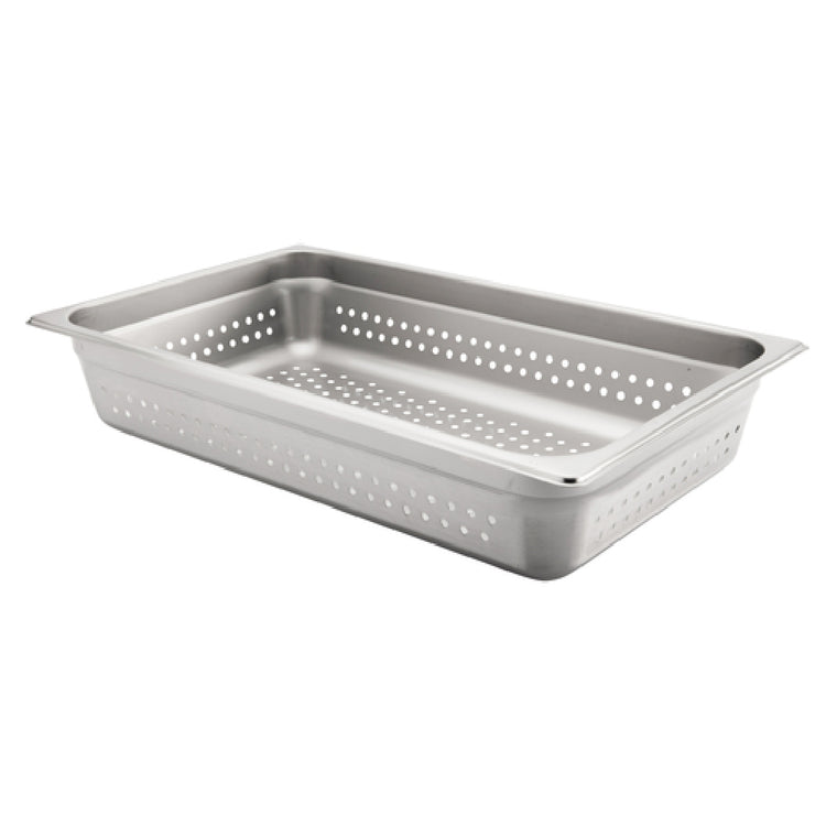 The Browne Foodservice 5781114 Steam Table Pan 1/1 Full Size 14.8 Qt. is a versatile and essential tool for any professional kitchen seeking durability and efficiency. Crafted from high-quality 18/8 stainless steel, this pan ensures superior resistance to corrosion and rust, making it ideal for long-lasting use in demanding foodservice environments. With dimensions of 20-3/4"L x 12-3/4"W x 4" deep, it provides ample space for cooking, storing, and serving a variety of dishes. The pan's 14.8-quart capacity is perfect for large-scale food preparation, catering to the needs of restaurants, catering services, and buffet setups. Its perforated design facilitates efficient draining, making it suitable for steaming vegetables or other moisture-rich foods. The anti-jam feature ensures easy stacking and separation, optimizing storage space and improving workflow efficiency in busy kitchens. Constructed with 24-gauge thickness, this steam table pan combines lightweight design with robust structural integrity, enhancing its usability across different food service segments. Whether employed in a high-volume cafeteria or a fine dining establishment, the Browne Foodservice 5781114 steam table pan delivers consistent performance and reliability, addressing the diverse requirements of the food industry with precision and professionalism.