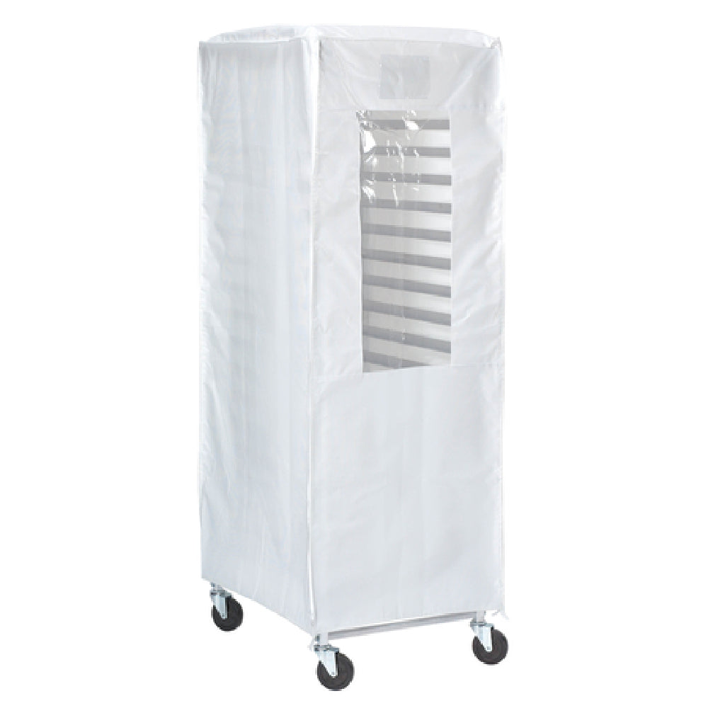 The Browne Foodservice 57913401 Rack Cover 23"W x 28"D x 62"H End Load is a high-performance protective cover designed for foodservice operations requiring reliable storage solutions. Crafted to endure harsh environments, this cover resists cracking at extreme temperatures down to -40°F (-40°C), ensuring durability in cold storage settings. The inclusion of a 6-1/2" x 5" clear menu card pocket allows for straightforward labeling and organization. For ease of handling, a hand strap is strategically positioned on the top seam. The cover features #5 zippers on two vertical seams, offering secure closure and accessibility. Enhanced with a 1" binding around both seams and hems, this rack cover promises reinforced durability. Made from polyester with a protective PVC coating, it stands out as a robust choice for protecting valuable food items. With its white color accented by a clear window, it not only provides functionality but also allows for easy visual inventory checks. Designed for end loading, this rack cover seamlessly integrates into diverse foodservice environments, from bakeries to catering operations, making it an essential component for maintaining food safety and quality.