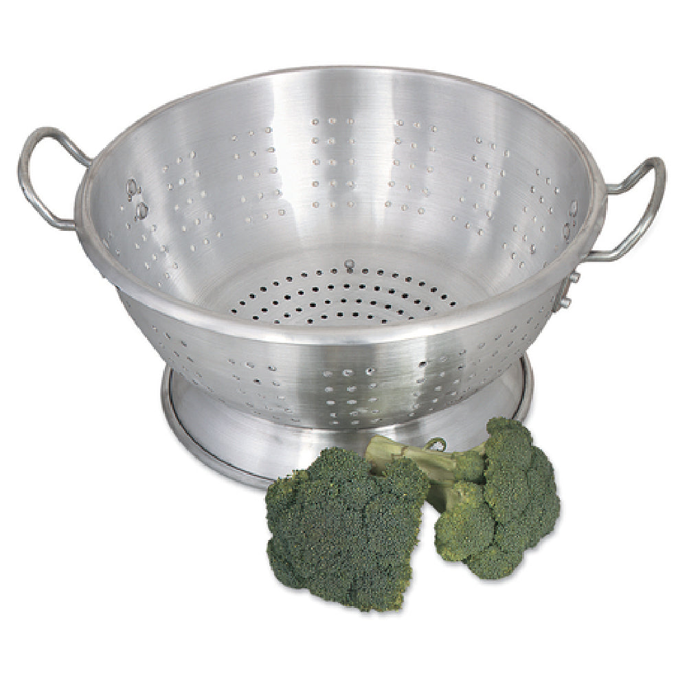 The Browne Foodservice 5811616 Colander is an essential tool for any commercial kitchen, boasting a substantial capacity of 15.1 quarts. With its dimensions of 16 inches in diameter and 7-1/4 inches in depth, it is well-suited for a range of food preparation tasks, from rinsing fresh produce to draining large quantities of pasta. The colander features 3/16-inch holes, allowing for efficient drainage while retaining even small food items. Crafted from heavy-duty aluminum with a 3.0 mm thickness, this colander ensures durability and long-lasting performance in high-volume environments. The sturdy riveted handles offer a secure grip for safe handling, while the rounded edges enhance user comfort. Additionally, the stand-alone base provides stability during use, minimizing the risk of tipping. Designed with the needs of different segments in the foodservice industry in mind, the Browne Foodservice 5811616 Colander is a versatile and reliable choice, meeting the rigorous demands of chefs and kitchen staff in restaurants, catering services, and institutional settings. Its robust construction and practical design make it an invaluable asset for any operation requiring efficient and dependable kitchen equipment.