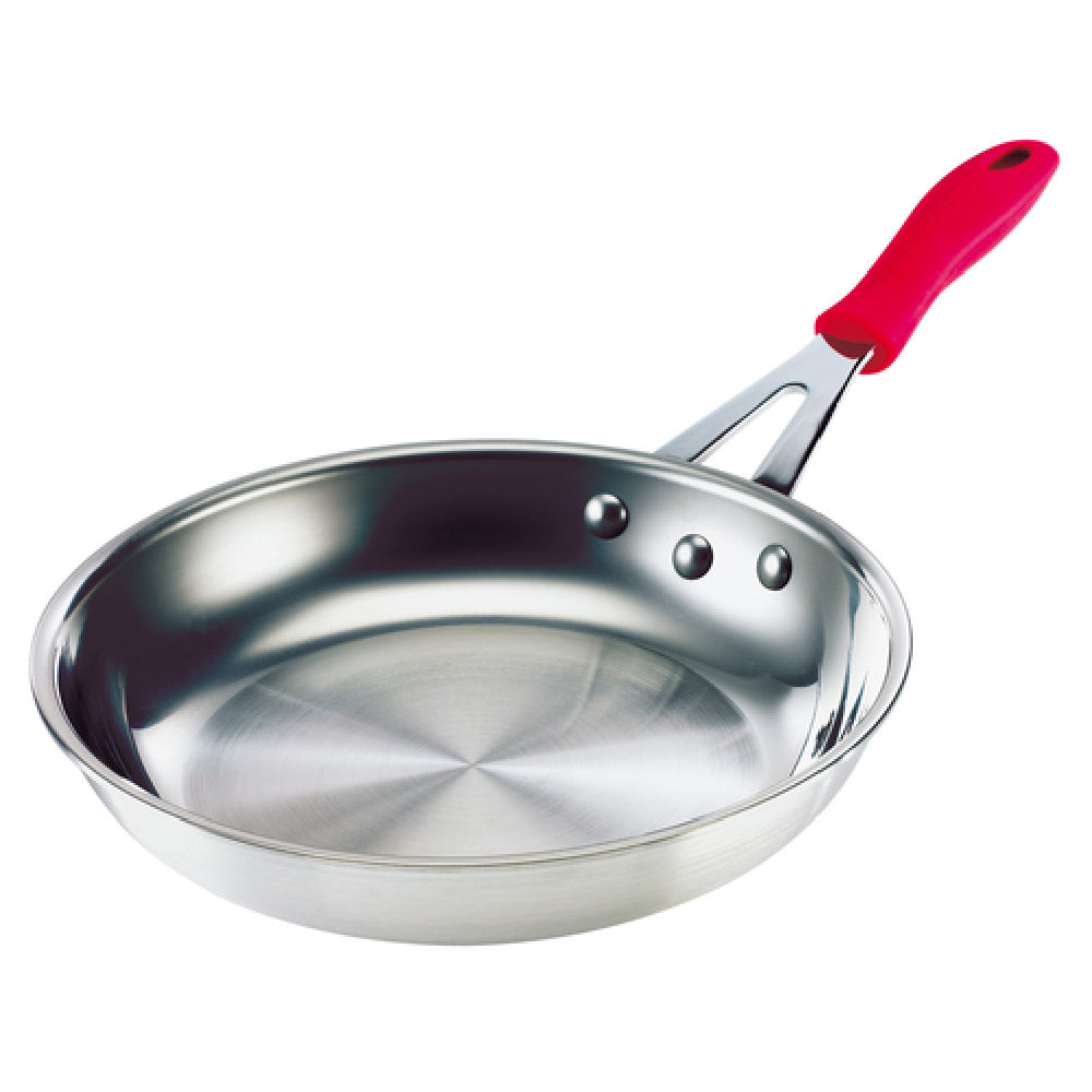 The Browne Foodservice 5812807 Thermalloy® Fry Pan is a versatile kitchen essential designed to meet the needs of professional chefs and culinary enthusiasts alike. Measuring 7" in diameter and 1-3/4" in height, this fry pan provides a compact yet effective cooking surface. It features a non-drip edge, ensuring mess-free cooking and enhancing its user-friendly design. The pan boasts a riveted steel handle, which is ergonomically designed for comfortable handling. The handle is equipped with a removable red silicone sleeve that is heat resistant up to 572°F, offering protection and versatility in high-temperature cooking environments. Constructed with a 2-ply stainless steel interior and an aluminum exterior, this fry pan delivers excellent heat distribution and durability, ensuring consistent performance during use. Its natural finish not only adds to its aesthetic appeal but also makes handling and cleaning more efficient. Compatible with gas, electric, ceramic, and halogen cooktops, this fry pan offers flexibility across various cooking platforms. Additionally, its corrosion-resistant properties enhance longevity, making it a reliable choice for foodservice operations. The product is NSF certified, reflecting its adherence to public health and safety standards, and is available in cash and carry packaging for convenience.