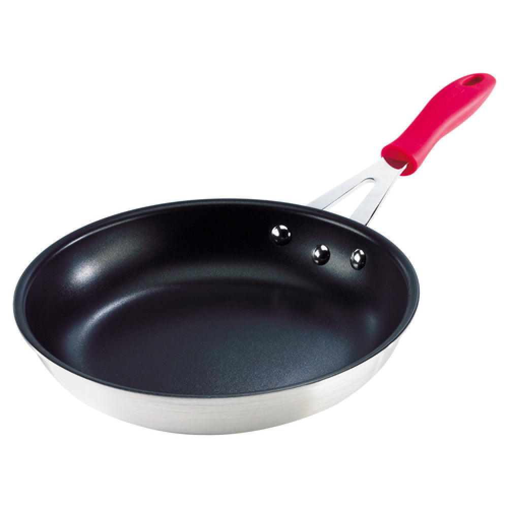 Browne Foodservice 5812830 Thermalloy® Fry Pan - 10" Dia. x 2-1/16"H Without Cover is a versatile and robust piece of cookware designed for professional kitchens and culinary enthusiasts. This fry pan features a non-drip edge, making it suitable for precise and clean pouring of sauces or reductions. The riveted steel handle comes with an ergonomic, removable red silicone sleeve, which is heat resistant up to 572°F, ensuring user safety during high-temperature cooking. Constructed with a 2-ply stainless steel interior and an aluminum exterior, this fry pan delivers excellent heat distribution and durability, making it ideal for searing, browning, and frying. The Excalibur® non-stick coating enhances its cooking performance by reducing the need for excessive oils and preventing food from sticking. Browne Foodservice's fry pan is corrosion resistant, which provides longevity and maintains its sleek appearance. Compatible with gas, electric, ceramic, and halogen cooktops, this pan is adaptable to various kitchen environments. Furthermore, it is NSF certified, highlighting its compliance with strict hygiene and safety standards. Its cash & carry packaging ensures convenience for both commercial buyers and individual customers, making it a valuable addition to any kitchen setup.