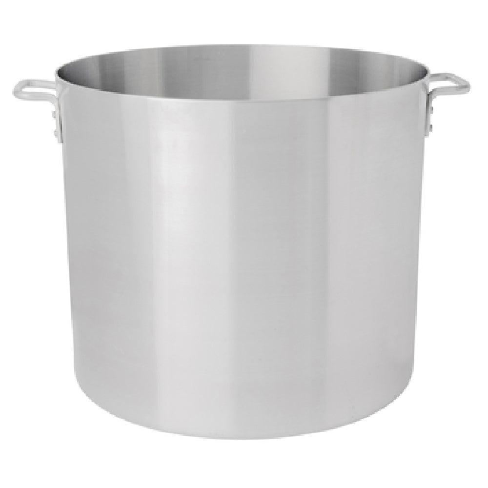 The Browne Foodservice 5813200 Thermalloy® Stock Pot is a substantial kitchen essential, boasting an impressive 100-quart capacity. With dimensions of 20-1/4" x 17-3/4", this stock pot is designed to handle large volumes, making it an invaluable asset for restaurants, catering services, and large-scale food preparation. Constructed from standard weight, 4-gauge aluminum, it ensures efficient heat distribution, essential for consistent cooking results. The natural finish contributes to its durability and ease of maintenance. This versatile pot is compatible with a variety of heat sources, including gas, electric, ceramic, and halogen, making it adaptable to different kitchen setups. Enhanced with oversized riveted handles, it offers secure handling and stability, even when filled to capacity. Although it does not come with a cover, its robust construction promises long-lasting performance in any professional kitchen environment. The NSF certification underscores its compliance with rigorous public health and safety standards, further solidifying its position as a reliable choice for foodservice professionals. Whether used for simmering stock, soups, or sauces, the Browne Foodservice 5813200 Thermalloy® Stock Pot embodies quality and functionality in the kitchen, catering to the needs of various market segments within the foodservice industry.