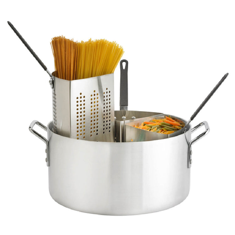 The Browne Foodservice 5813319 Thermalloy® Pasta Cooker Insert Only 3 Qt. Perforated is a specialized culinary tool designed for both professional kitchens and home cooking enthusiasts seeking precision and quality in pasta preparation. This insert, crafted from high-grade stainless steel, promises durability and resistance to corrosion, ensuring long-lasting performance in demanding environments. With a capacity of 3 quarts, it is ideally sized for efficient pasta cooking, balancing between volume and manageability. The perforated design is an essential feature, allowing for optimal water drainage and easy straining, which simplifies the cooking process and enhances the texture of the pasta. This pasta cooker insert is compatible with Thermalloy® cookware, which is renowned for its excellent heat distribution, further supporting consistent cooking results. Its polished finish not only adds to its aesthetic appeal but also facilitates easy cleaning, maintaining hygiene standards required in the foodservice industry. The Browne 5813319 is suitable for a variety of kitchen settings, from busy restaurant environments requiring reliable equipment to domestic kitchens where quality and performance are paramount. This insert is a valuable asset for those in the foodservice sector looking to improve their pasta dishes with precise cooking tools.