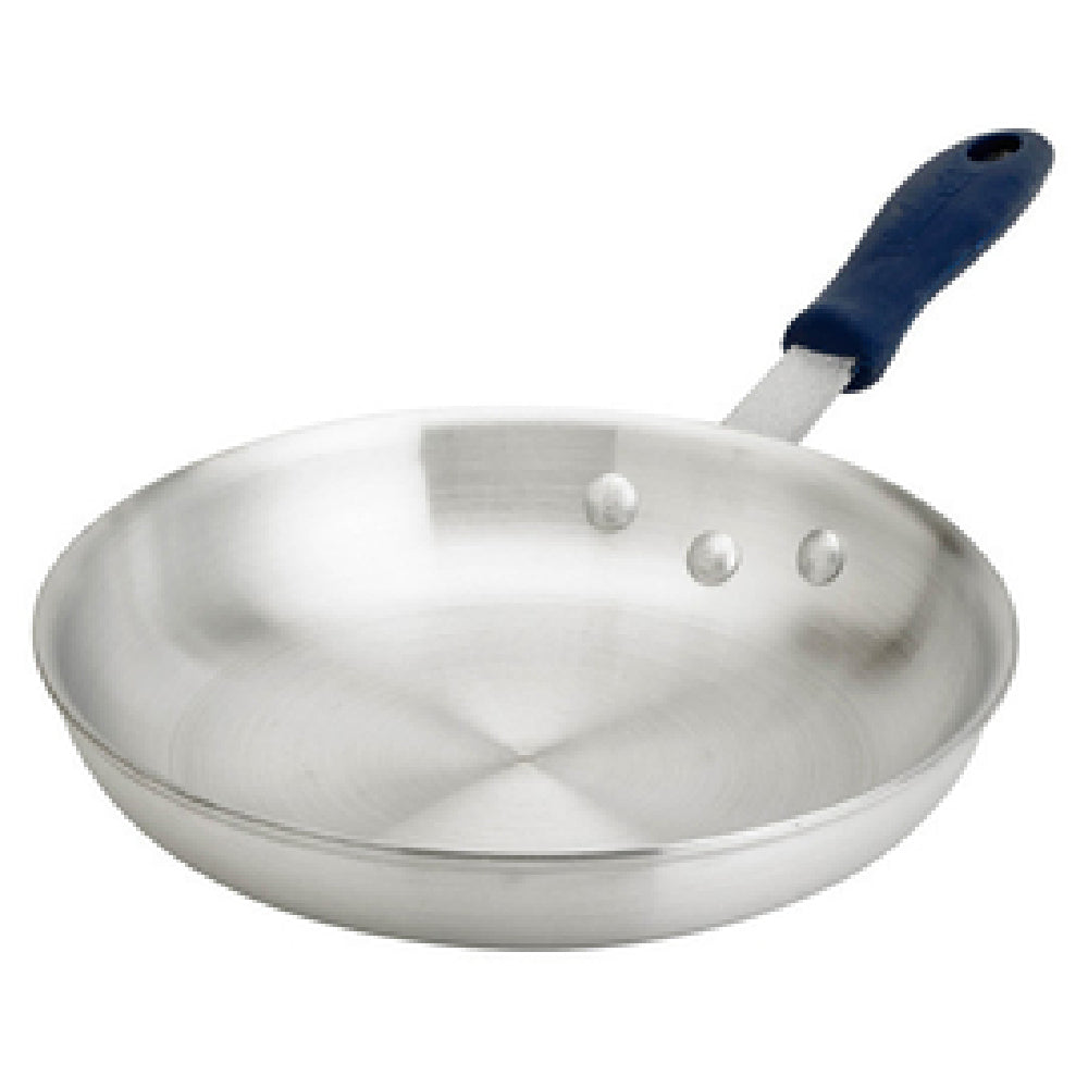 The Browne Foodservice 5813807 Thermalloy® Fry Pan 7" Dia. X 1-3/10" Without Cover is a finely crafted kitchen essential, ideal for professional chefs and culinary enthusiasts alike. This fry pan boasts a 7-inch diameter and a depth of 1-3/10 inches, providing ample space for a variety of cooking tasks. Constructed from 8-gauge aluminum, it ensures even heat distribution, enhancing cooking performance. The ergonomic handle features off-set rivets, promoting durability and ease of use. Additionally, the pan includes a removable blue silicone sleeve that is heat resistant up to 572°F, enhancing user safety and comfort. This fry pan is versatile, compatible with gas, electric, ceramic, and halogen cooktops, making it a valuable asset across multiple cooking environments. Its natural finish emphasizes its standard weight, contributing to its practicality in busy kitchens. Certified by NSF, this fry pan meets strict public health and safety standards. The Browne Foodservice 5813807 Thermalloy® Fry Pan is designed for those who require reliable, efficient cookware that adapts to various heat sources, making it an ideal choice for foodservice operations seeking quality and performance in their kitchen tools.