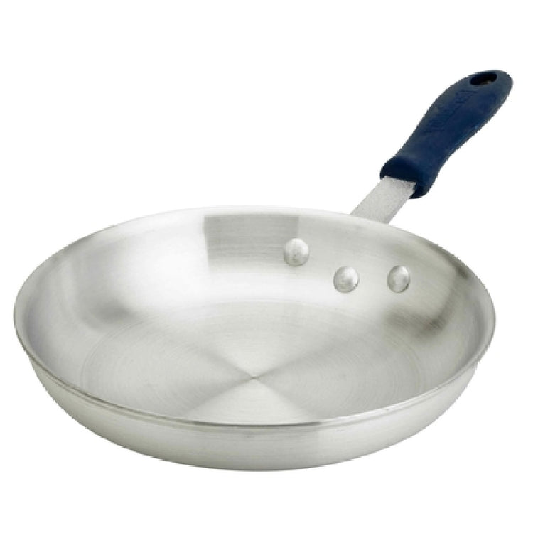 The Browne Foodservice 5813808 Thermalloy-Fry Pan, measuring 8 inches in diameter and 1-1/2 inches in height, is crafted for culinary professionals seeking performance and durability without compromise. Engineered without a cover, this fry pan features a handle with off-set rivets, adding stability and strength for rigorous kitchen use. To enhance safety and comfort, it includes an ergonomic removable blue silicone sleeve, which is heat resistant up to 572°F. This makes it suitable for high-temperature cooking on various heat sources, including gas, electric, ceramic, and halogen stoves. Constructed from 8-gauge aluminum, the pan offers a standard weight with a natural finish, ensuring even heat distribution and long-lasting performance. Its NSF certification underscores its compliance with stringent public health standards, making it a reliable choice for professional kitchens. The Browne Foodservice 5813808 Thermalloy-Fry Pan combines essential features with meticulous design, catering to diverse market segments within the foodservice industry, from bustling restaurants to gourmet catering services, offering exceptional cooking results with every use.