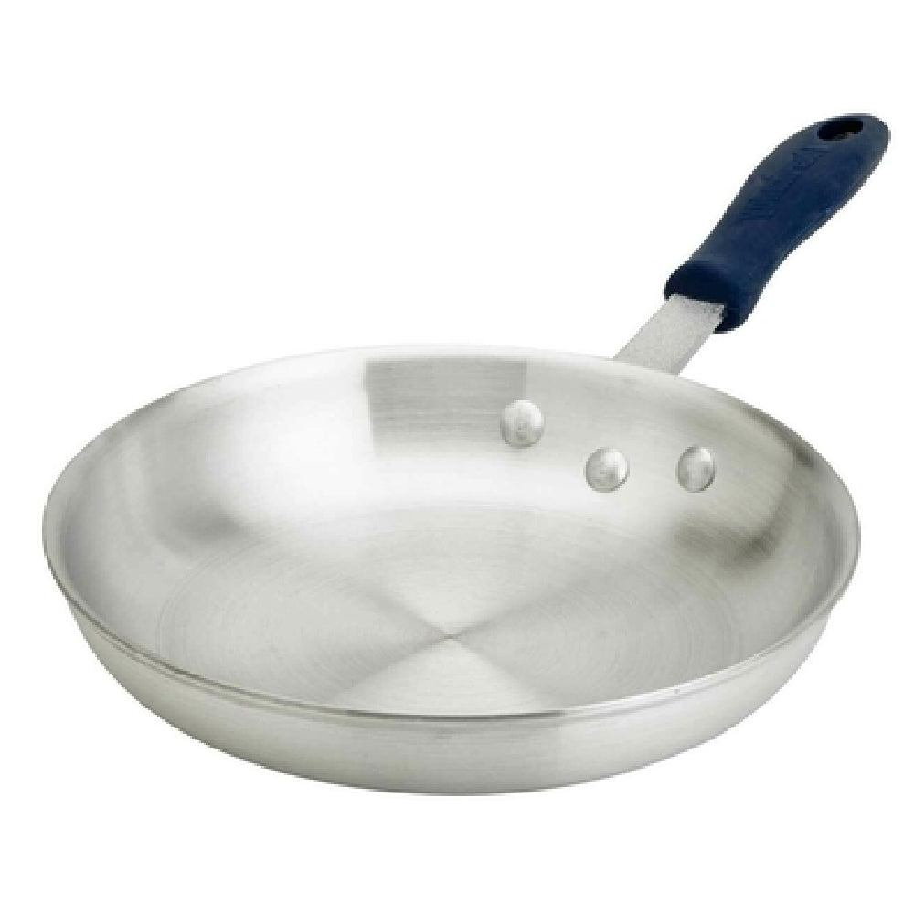 The Browne Foodservice 5813812 Thermalloy® Fry Pan 12" Dia. X 2-3/10" Without Cover is a versatile and durable cookware option designed for professional kitchens. With a diameter of 12 inches and a depth of 2-3/10 inches, this fry pan is suitable for a variety of cooking tasks, from sautéing to frying. Constructed from standard weight, 8-gauge aluminum, it provides excellent heat conductivity and durability. The pan features an ergonomic handle with off-set rivets for enhanced comfort and stability during use. Additionally, the handle includes a removable blue silicone sleeve that is heat resistant up to 572°F, ensuring safety and ease of handling. The pan is compatible with multiple heat sources, including gas, electric, ceramic, and halogen, providing flexibility in various culinary environments. Its natural finish not only enhances its aesthetic appeal but also facilitates easy food release and cleaning. Certified by the NSF, this fry pan meets high standards of public health and safety, making it a reliable choice for the foodservice industry. The Browne Foodservice 5813812 Thermalloy® Fry Pan is an essential tool for chefs and culinary professionals seeking performance and longevity in their kitchen equipment.